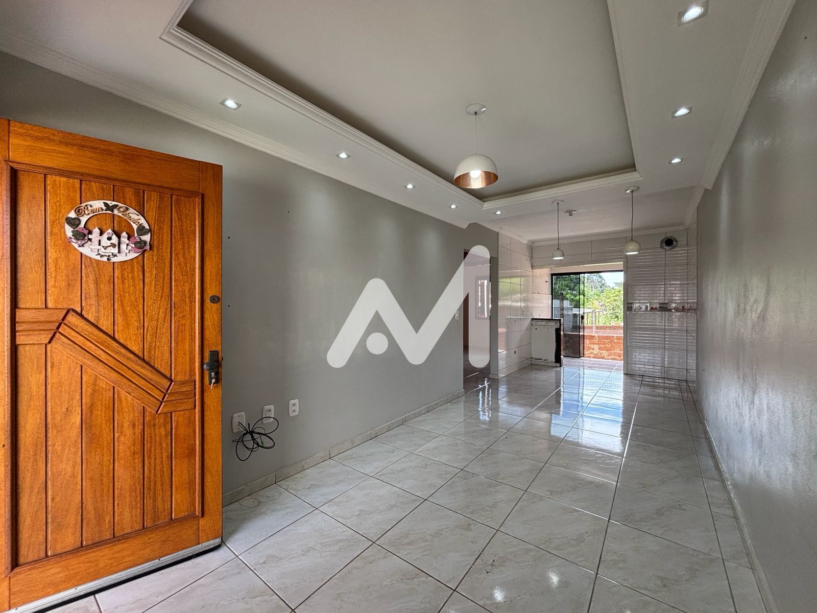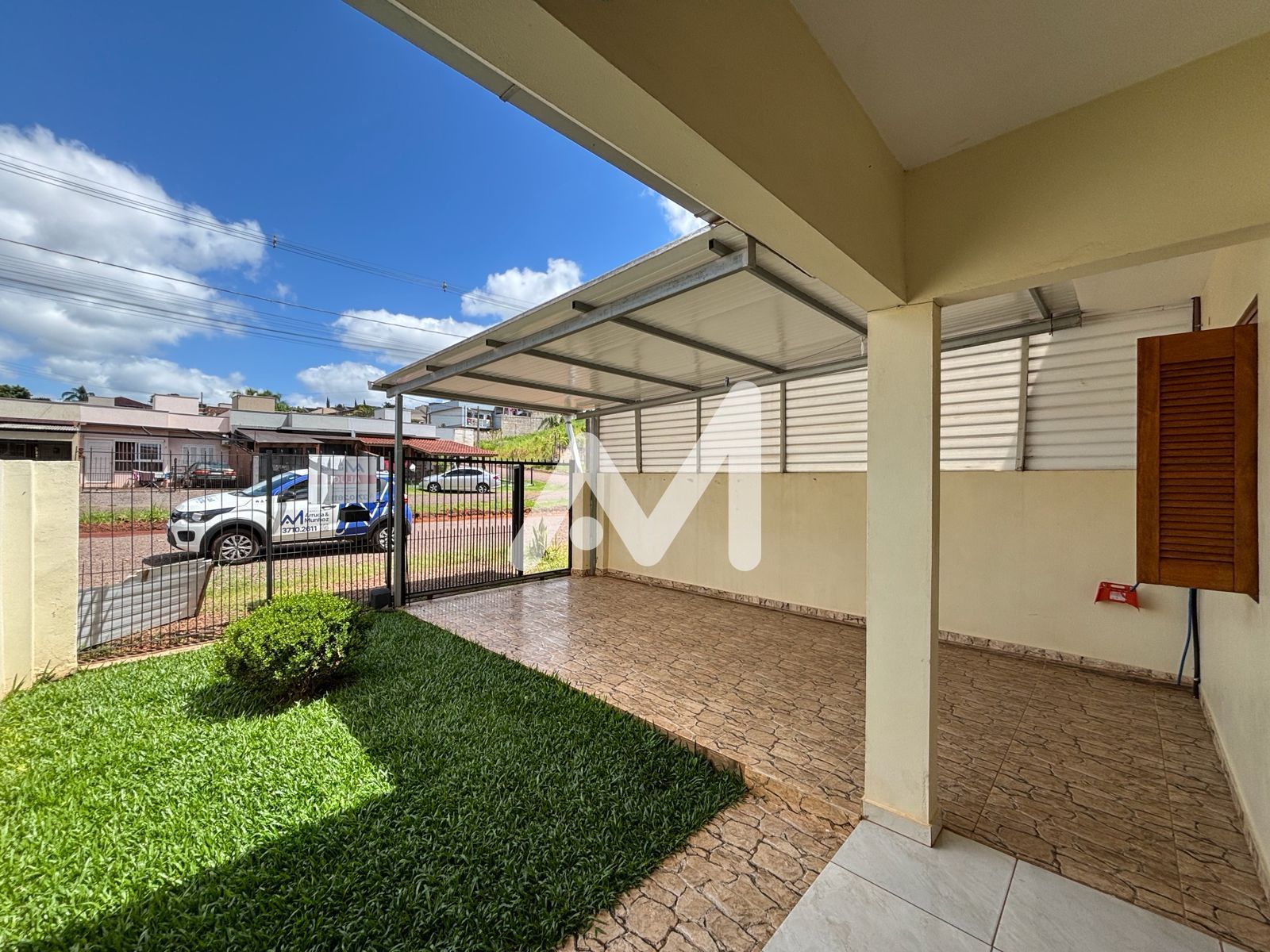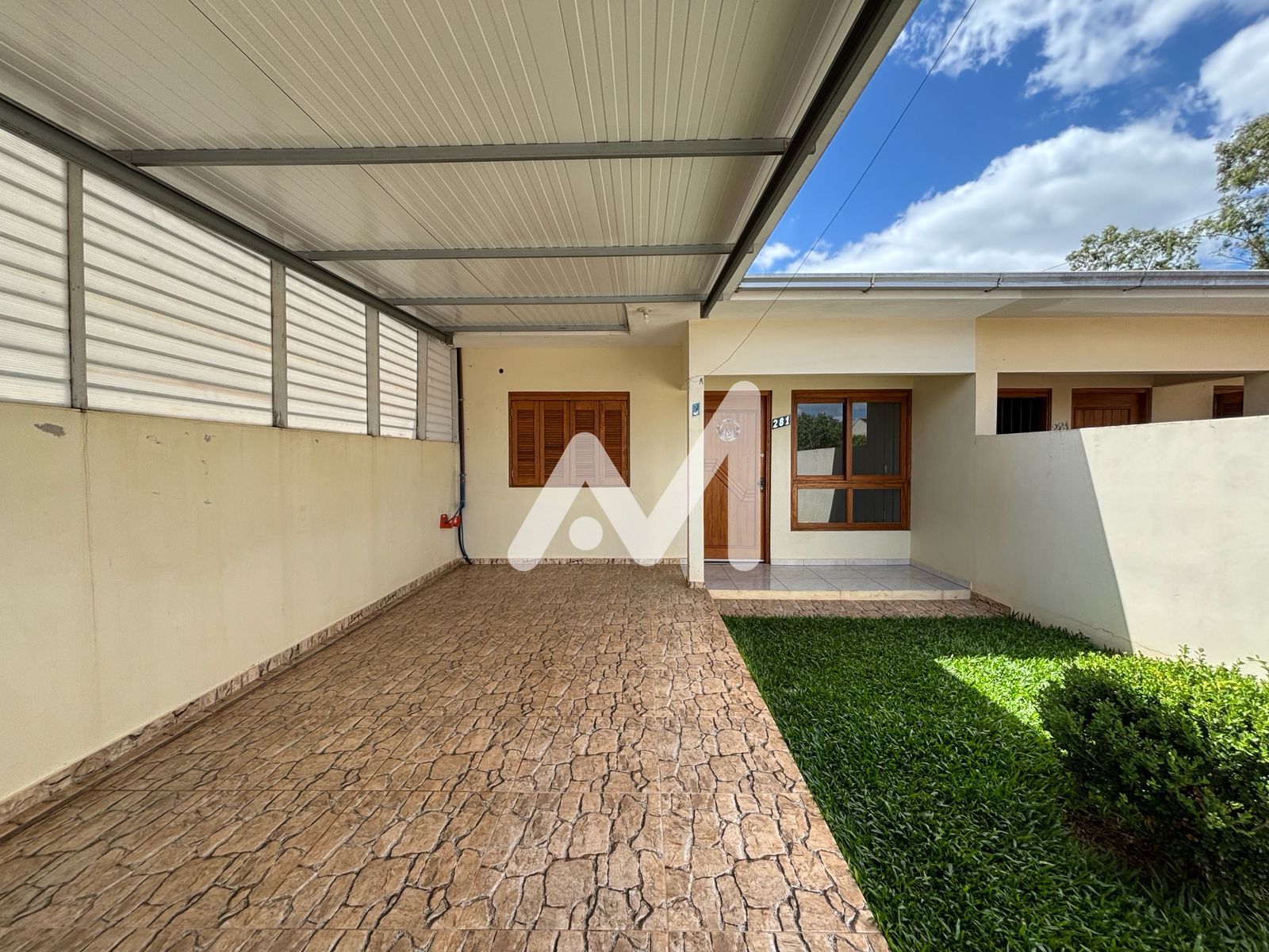 Casa geminada com 02 dormitórios, sala, cozinha, banheiro, área de serviço, pátio nos fundos, churrasqueira, garagem coberta na frente.