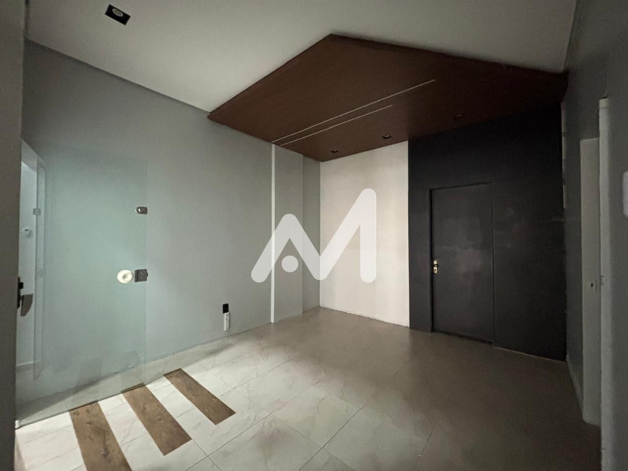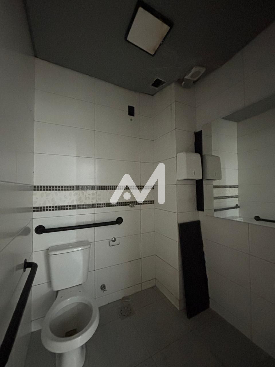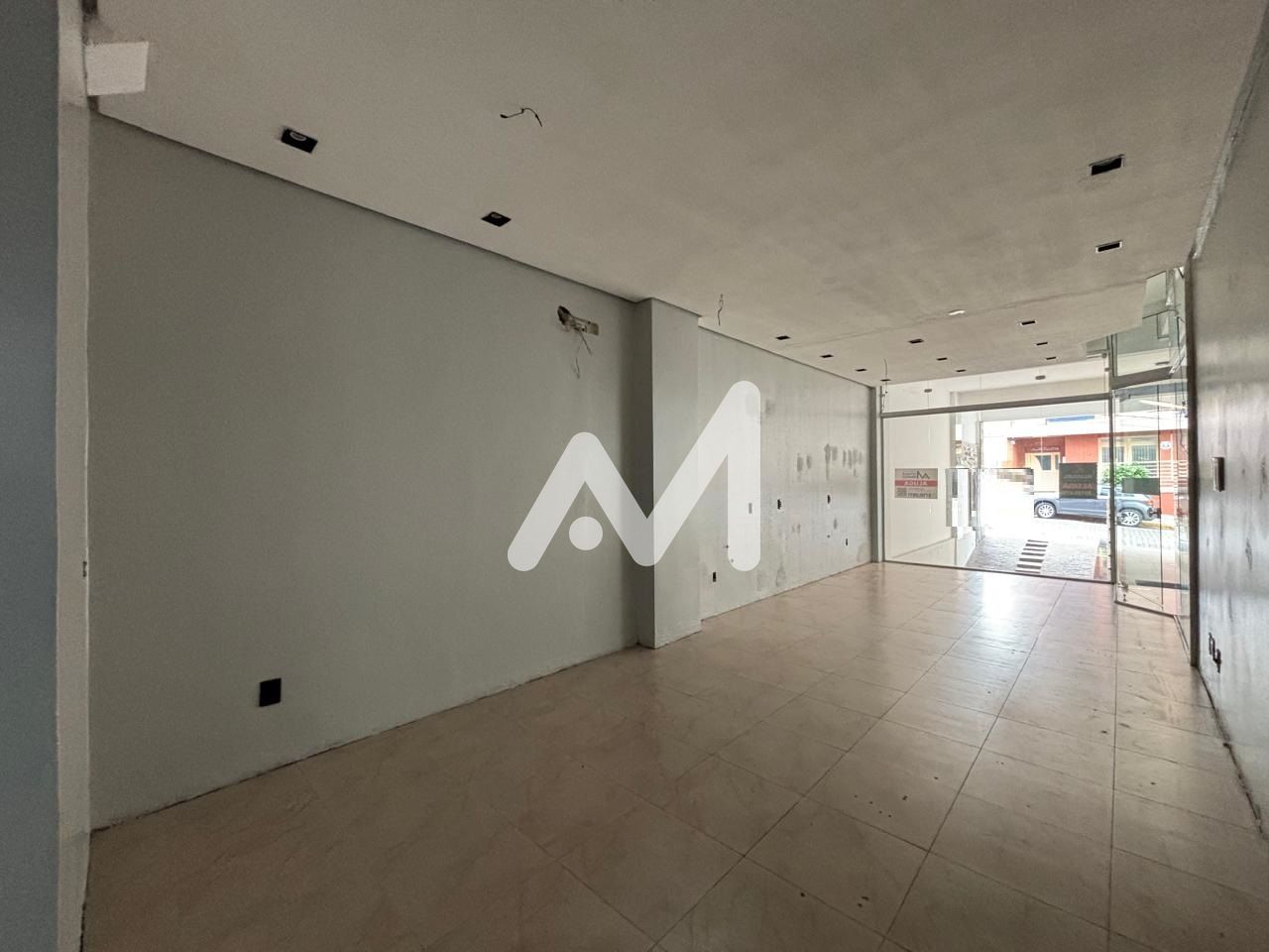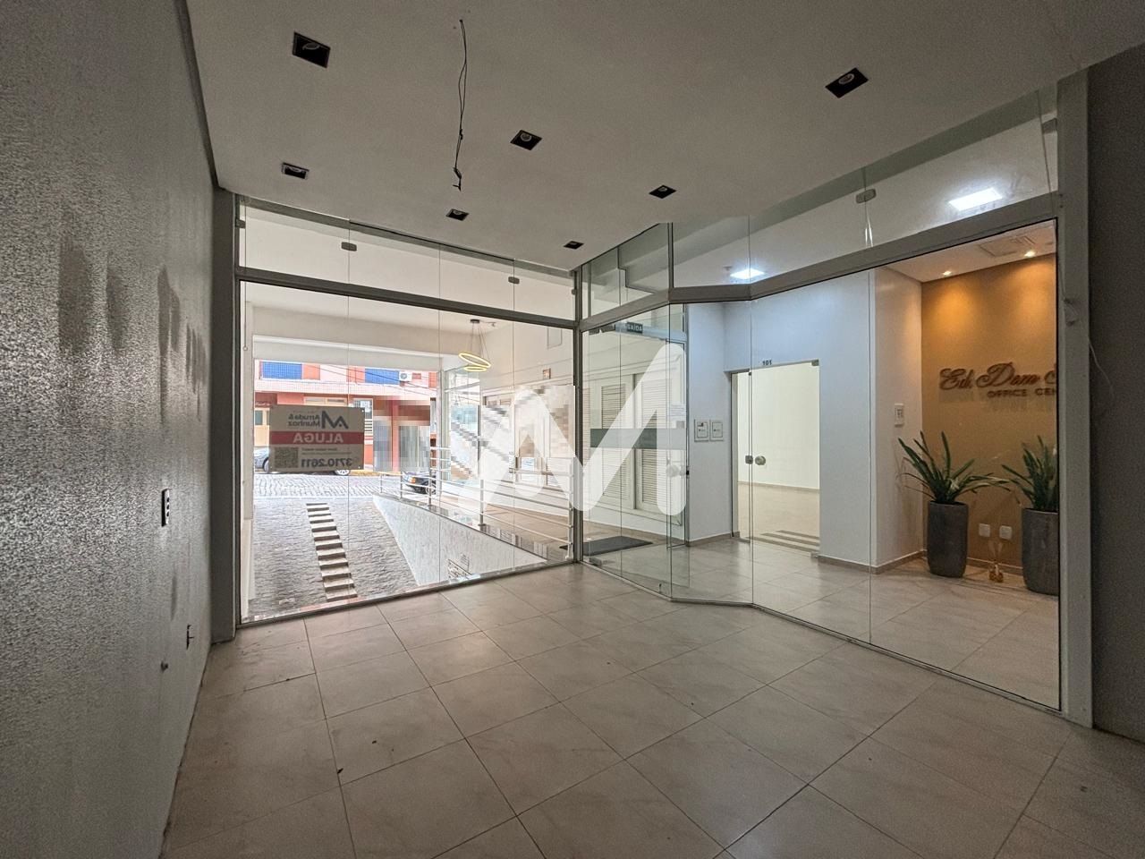 Loja térrea, banheiro, vitrine de frente, entrada lateral, Box de estacionamento no centro.
