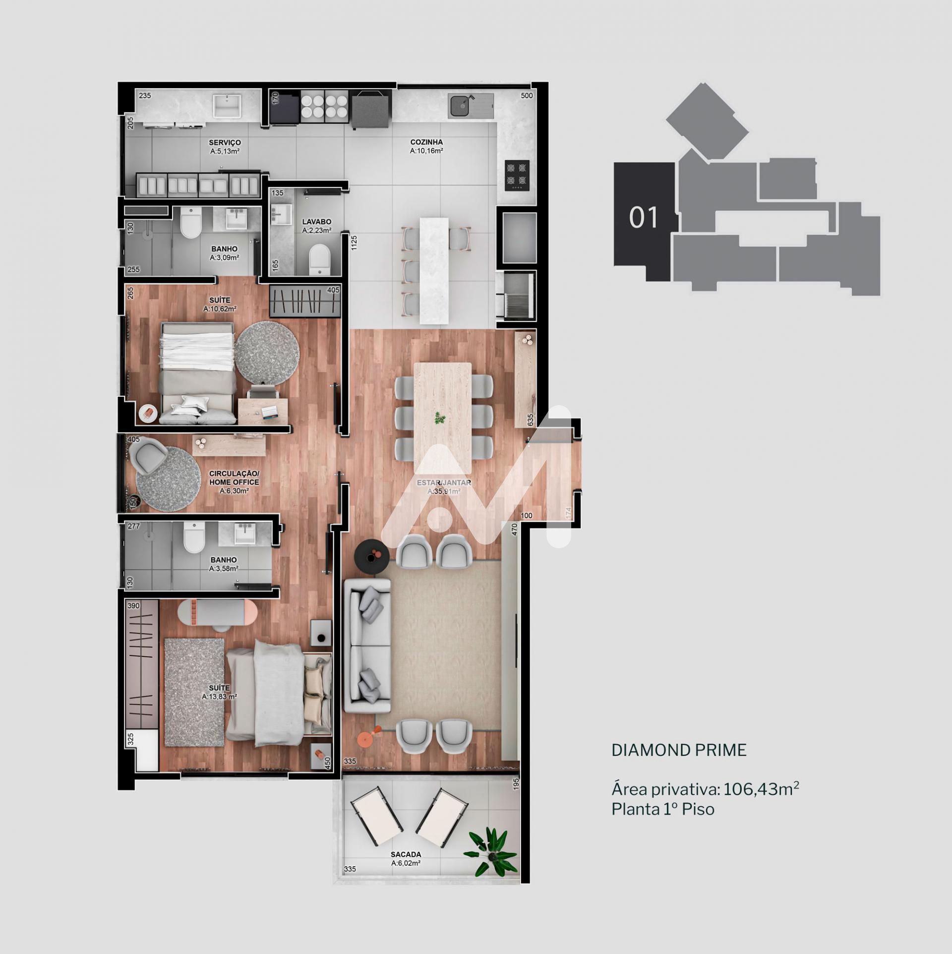 Apartamento em construção com 02 suítes, sala de estar, jantar, lavabo, cozinha, área de serviço separada, churrasqueira, sacada e 01 box de estacionamento no Subsolo. Previsão de entrega Dezembro/2025.