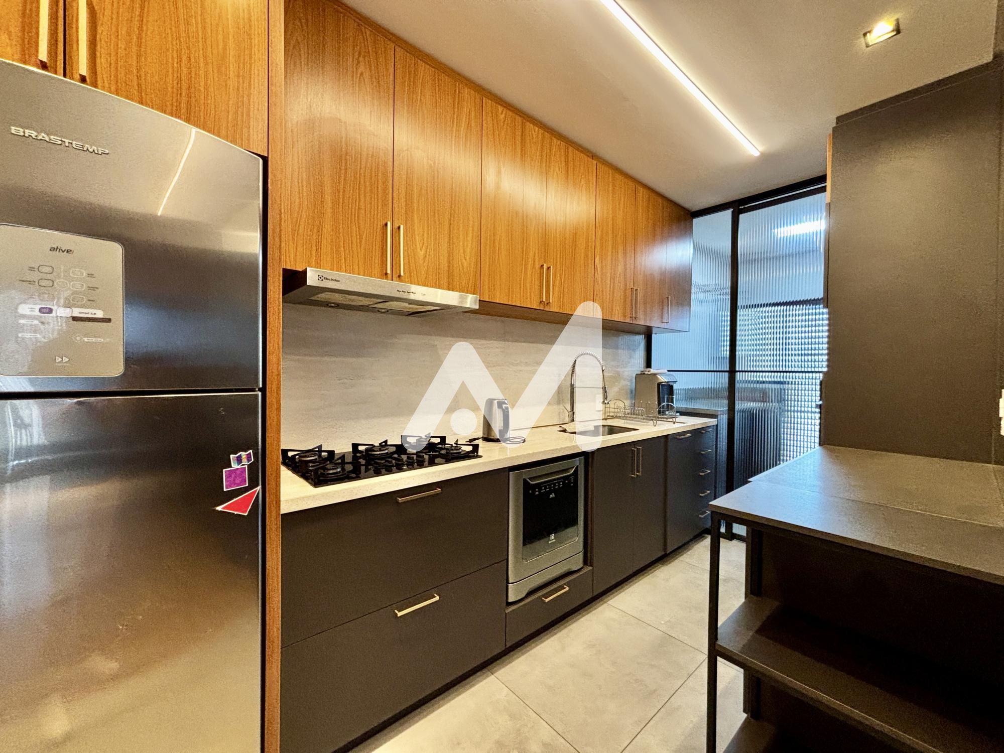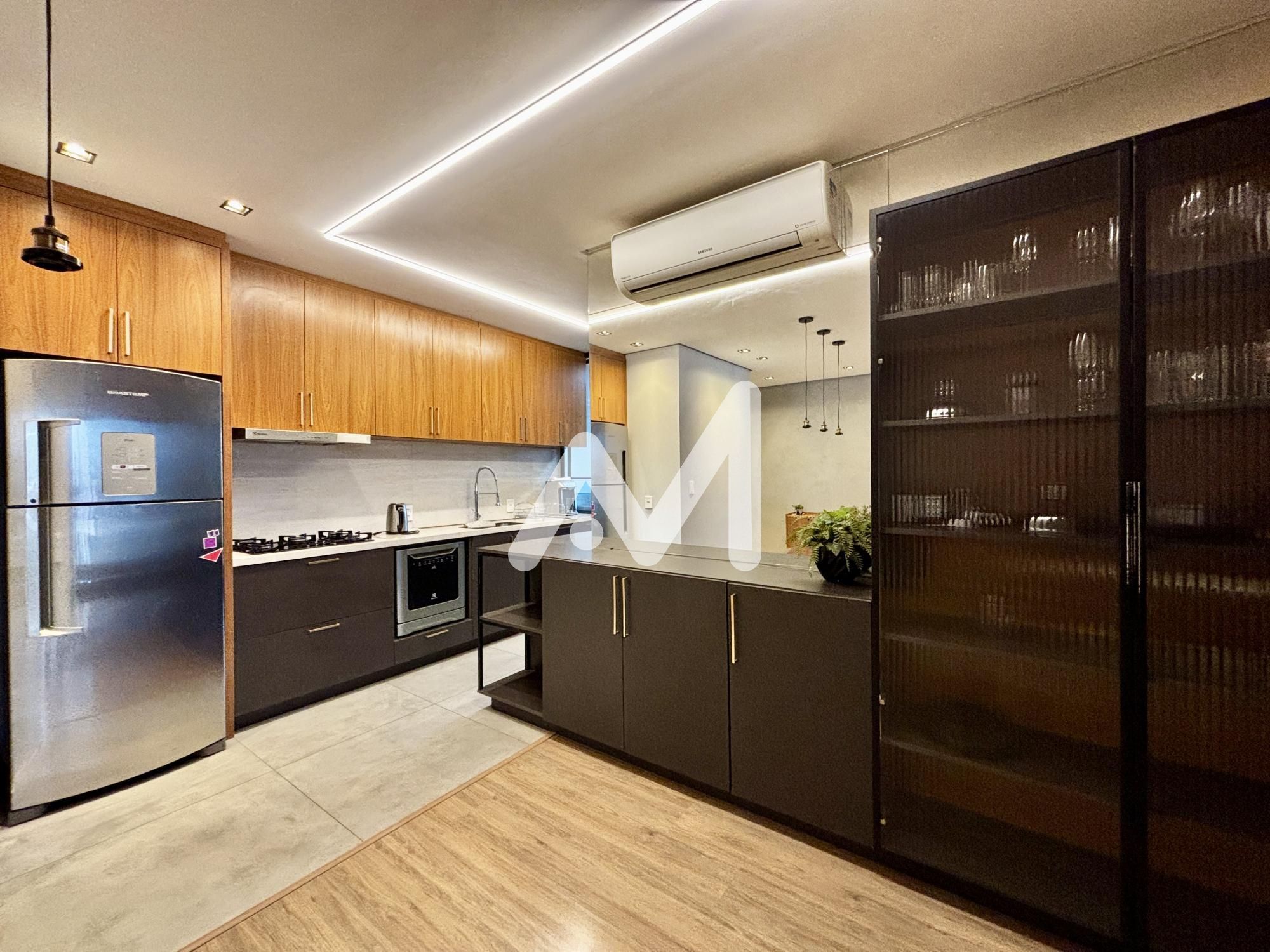 Sala ampla de estar e jantar / split, cozinha sob medida e eletrodomésticos, lavanderia, 03 dormitórios / 01 suíte, ambos com split, , lavabo e banheiro social, varanda integrada com churrasqueira, vista de frente com sol da manhã e Box de estacionamento. Sai geladeira ,rack e sofá.