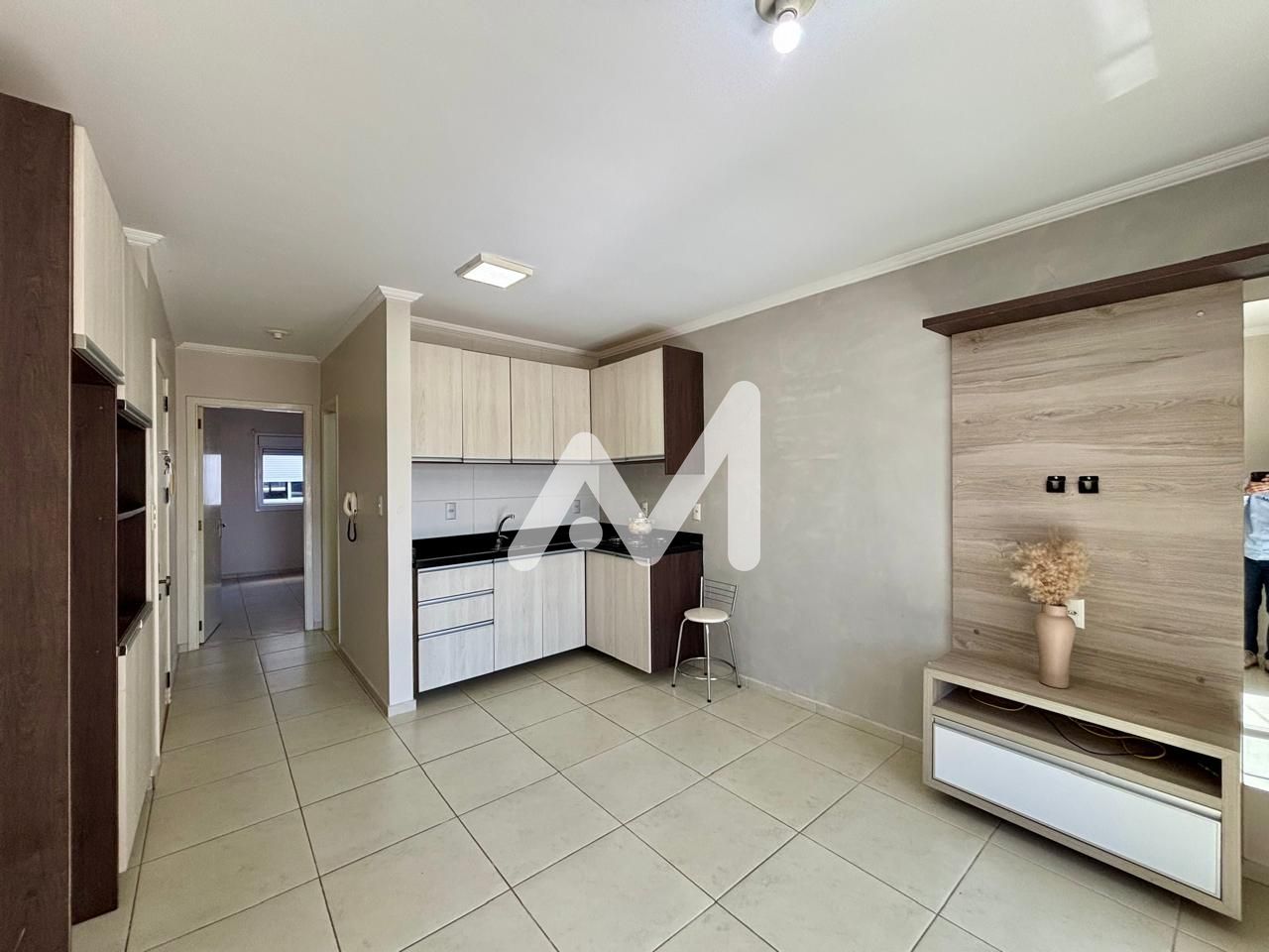 Belíssimo apartamento semimobiliado com móveis planejados, composto por 01 dormitório, cozinha, sala de estar/jantar, banheiro social, sacada, churrasqueira, espera para água quente, gás central, elevador. Cozinha integrada com a sala