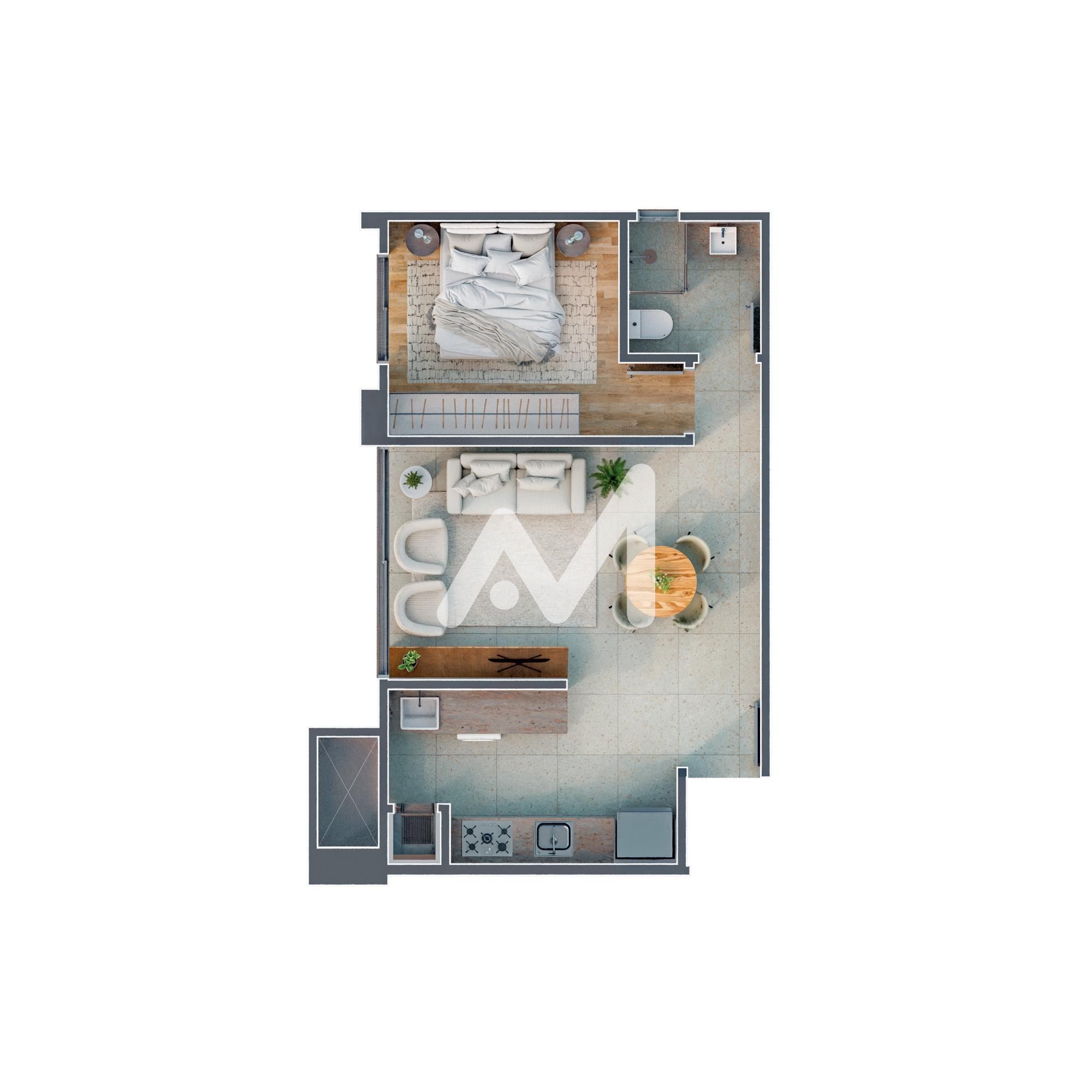 Apartamento em construção de 01 dormitório, porcelanato e laminado, janelas amplas, acabamento classe "A" e box de estacionamento.