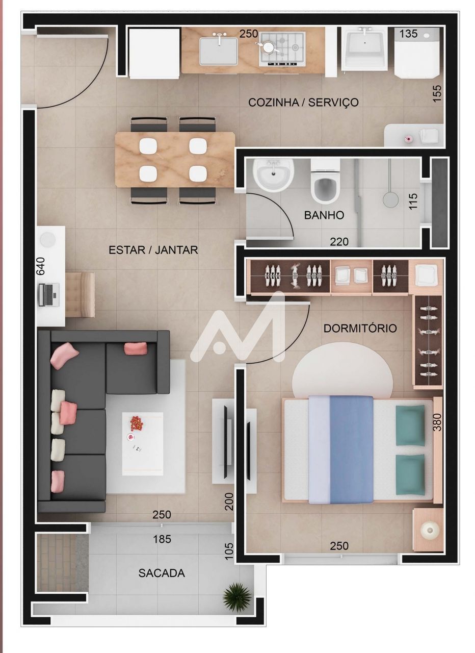 Apartamento 01 dorm., sacada com churrasqueira. Excelente localização, garagem, piso porcelanato