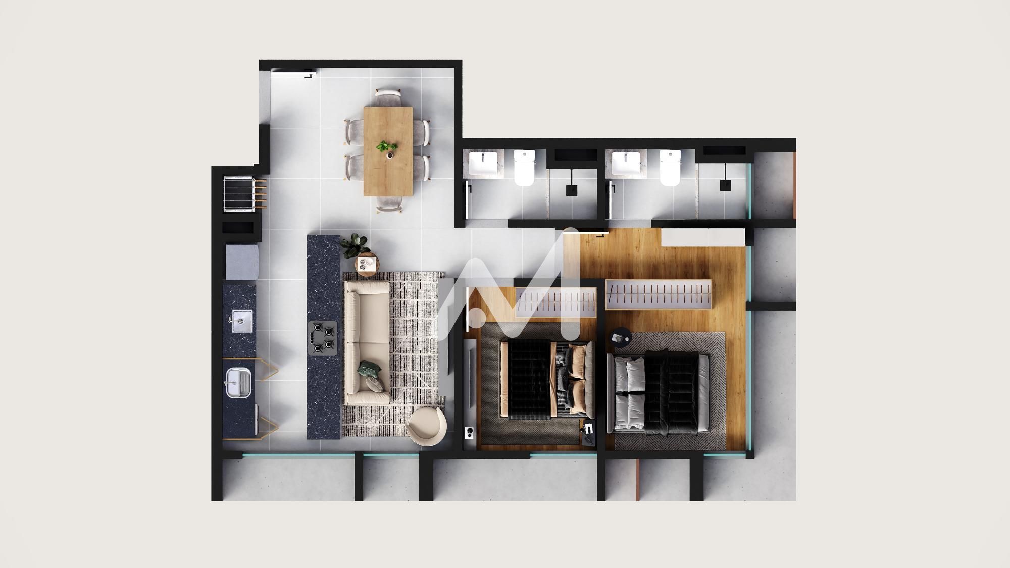 Apartamento com 02 dorm., sendo 01 suíte, sala estar/jantar, cozinha, área de serviço, churrasqueira.