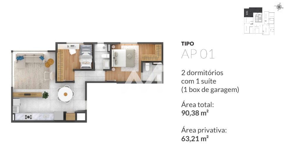 Apartamento em construção de 02 dormitórios com suíte, box de estacionamento.