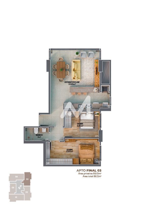 Apartamento em construção de 02 dormitórios, porcelanato e laminado, janelas amplas, acabamento classe "A" e box de estacionamento.