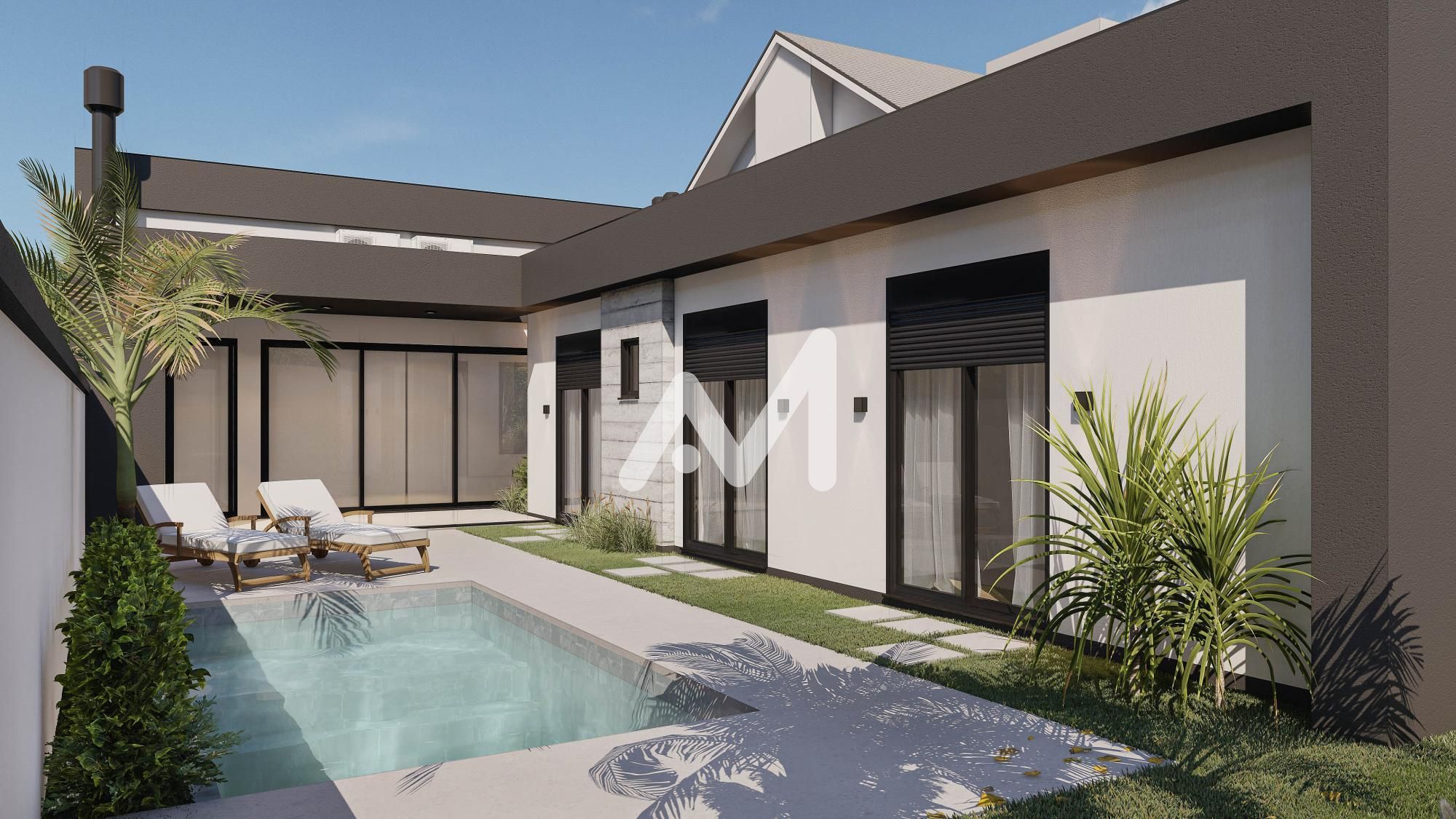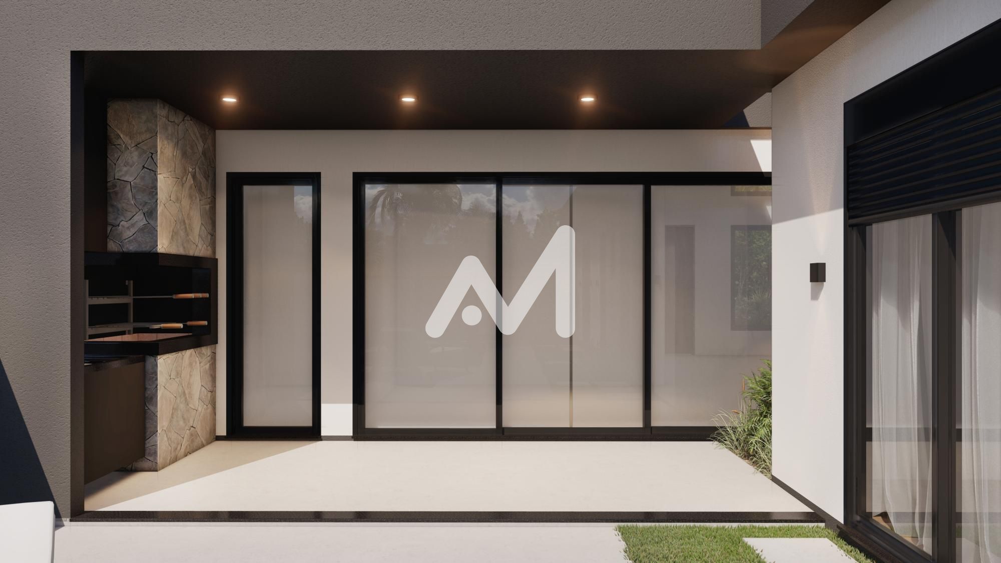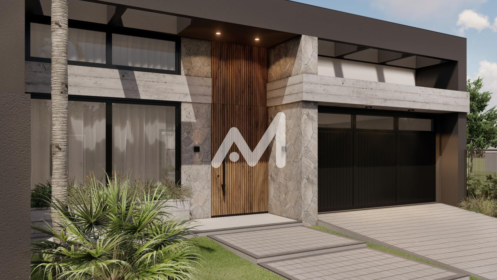 Residência térrea, cobertura em estilo platibanda, área gourmet com churrasqueira, cozinha, sala de jantar, sala de estar com lareira, lavabo, garagem, área de serviço, dois dormitórios com suíte americana, suíte master com closet, espaço para home office, lavanderia e piscina.