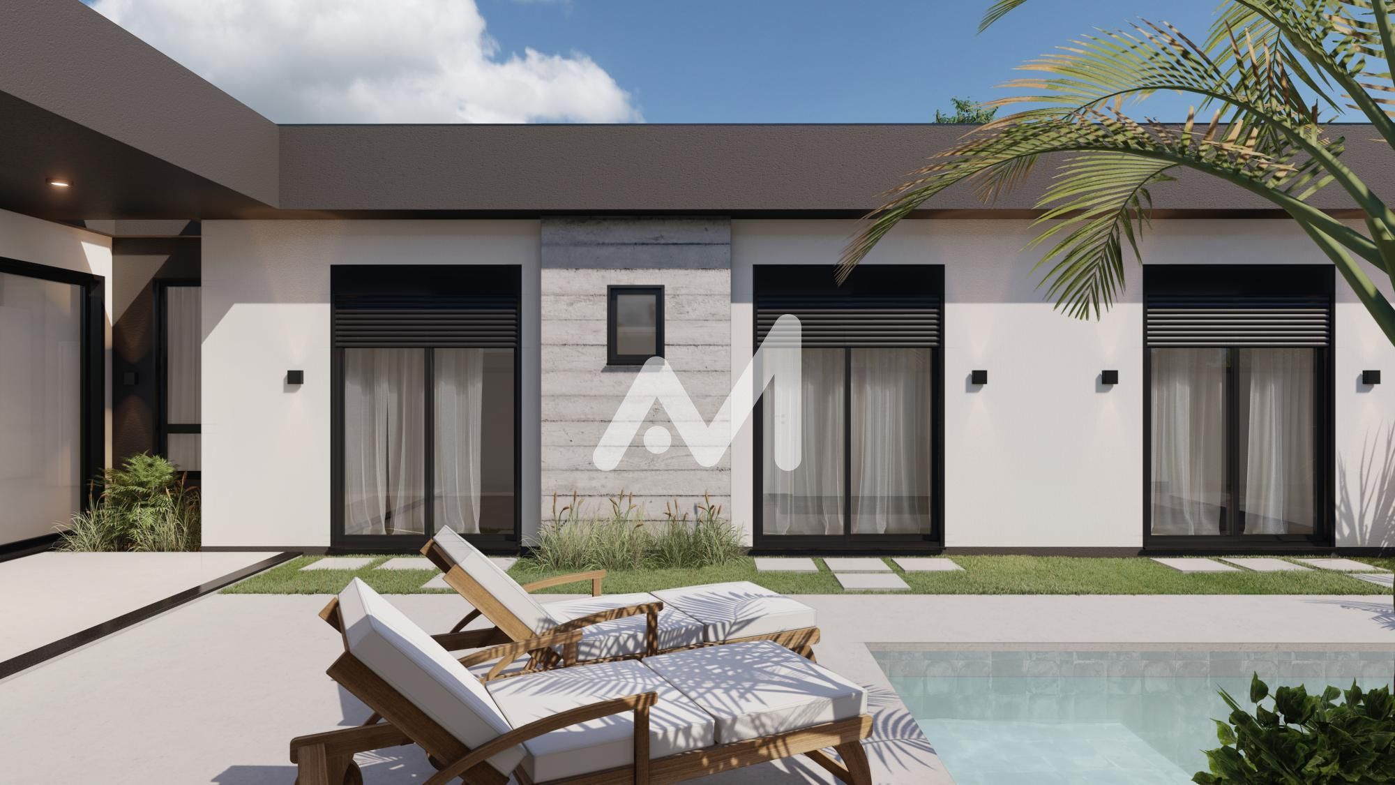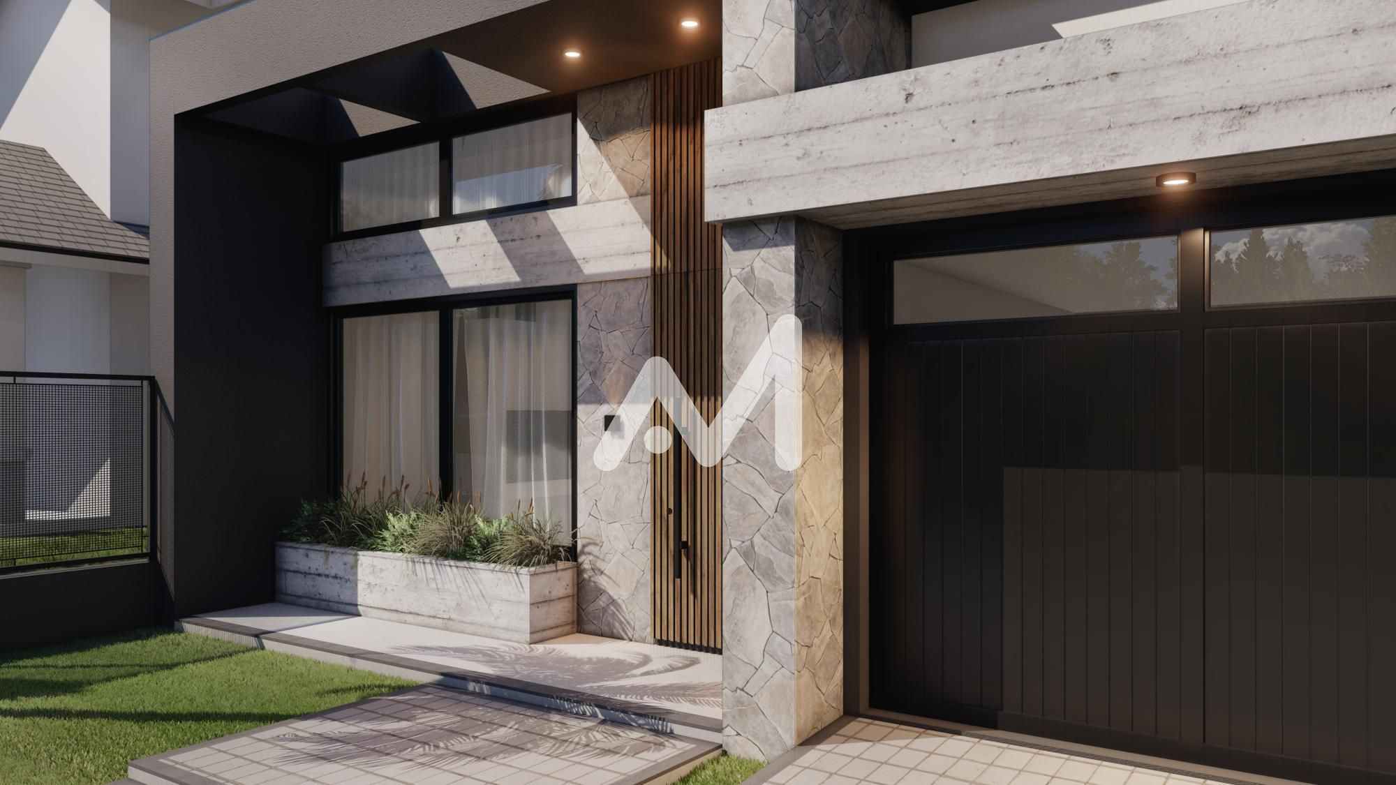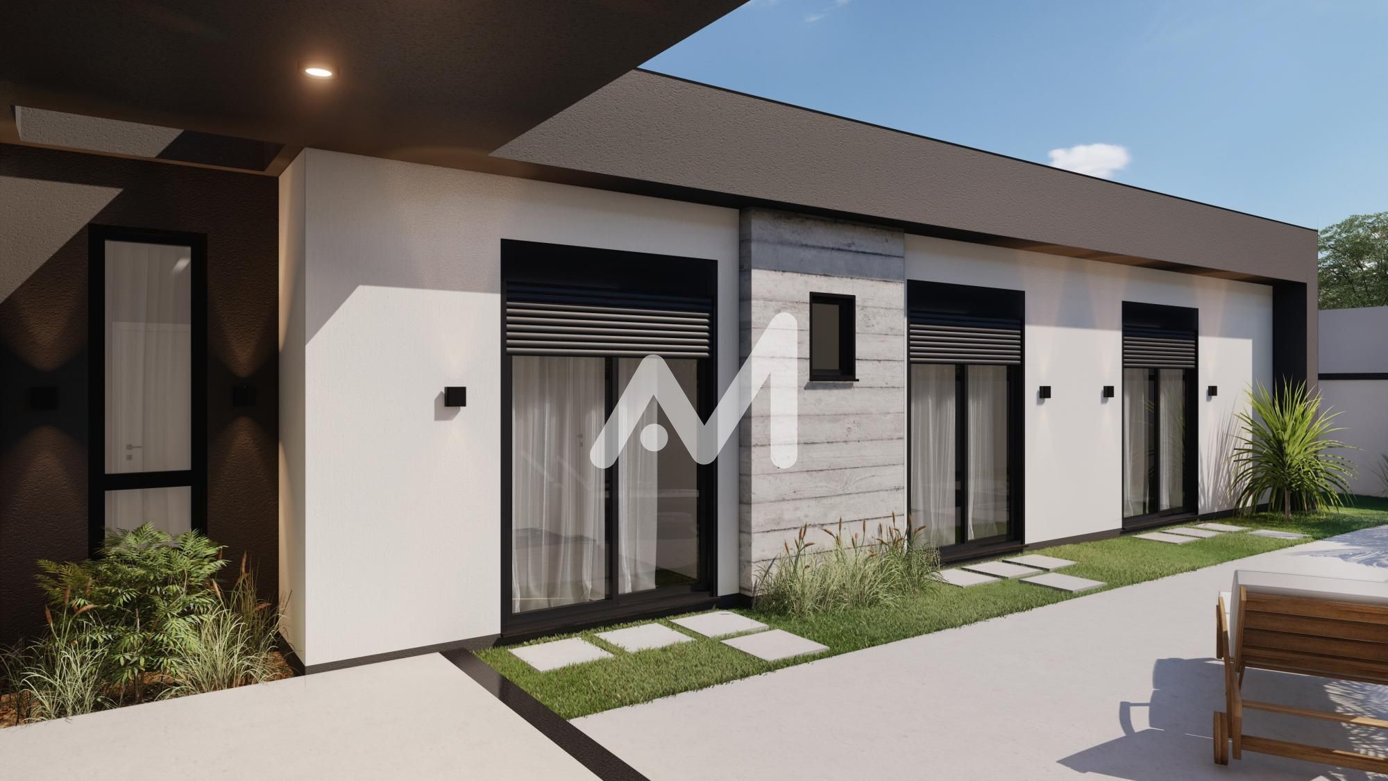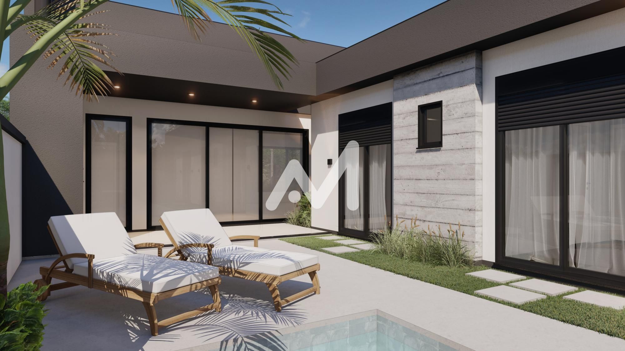 Residência térrea, cobertura em estilo platibanda, área gourmet com churrasqueira, cozinha, sala de jantar, sala de estar com lareira, lavabo, garagem, área de serviço, dois dormitórios com suíte americana, suíte master com closet, espaço para home office, lavanderia e piscina.