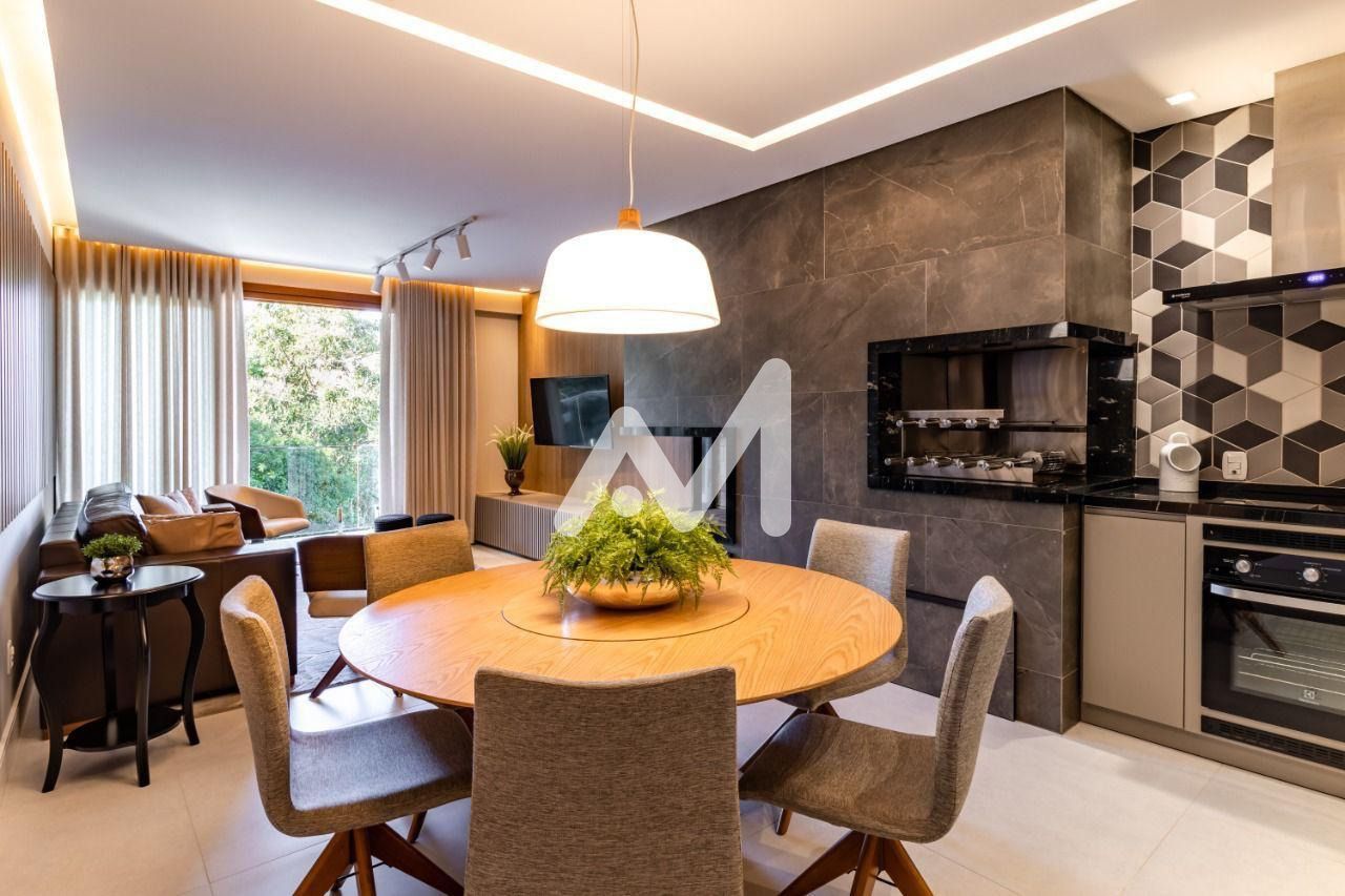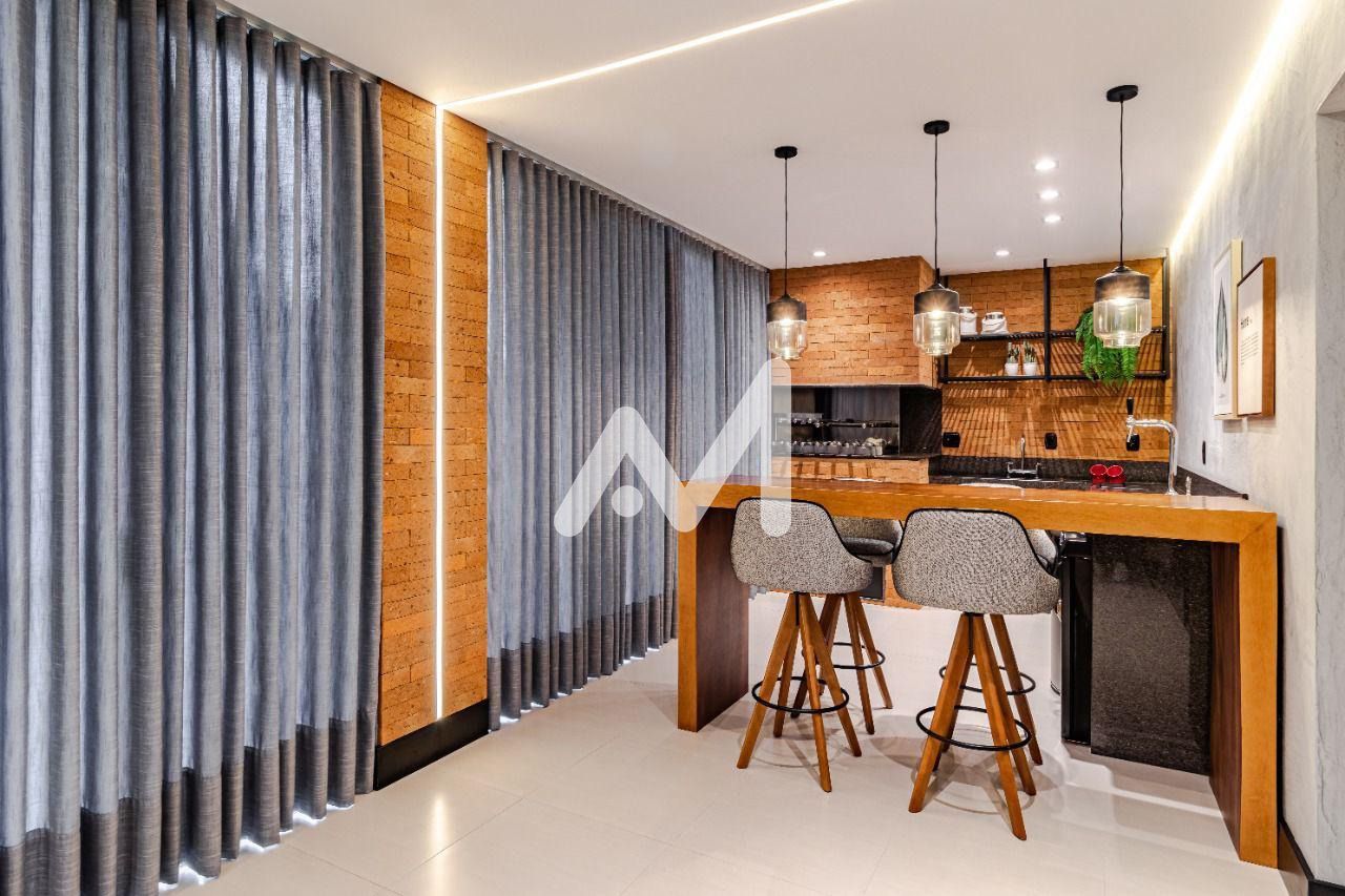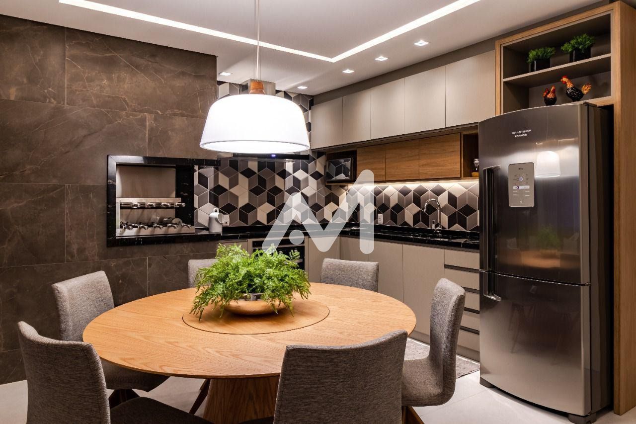 Móveis sob medida, geladeira, forno, micro-ondas, fogão por indução, coifa, churrasqueira rotativa e mesa com seis cadeiras.