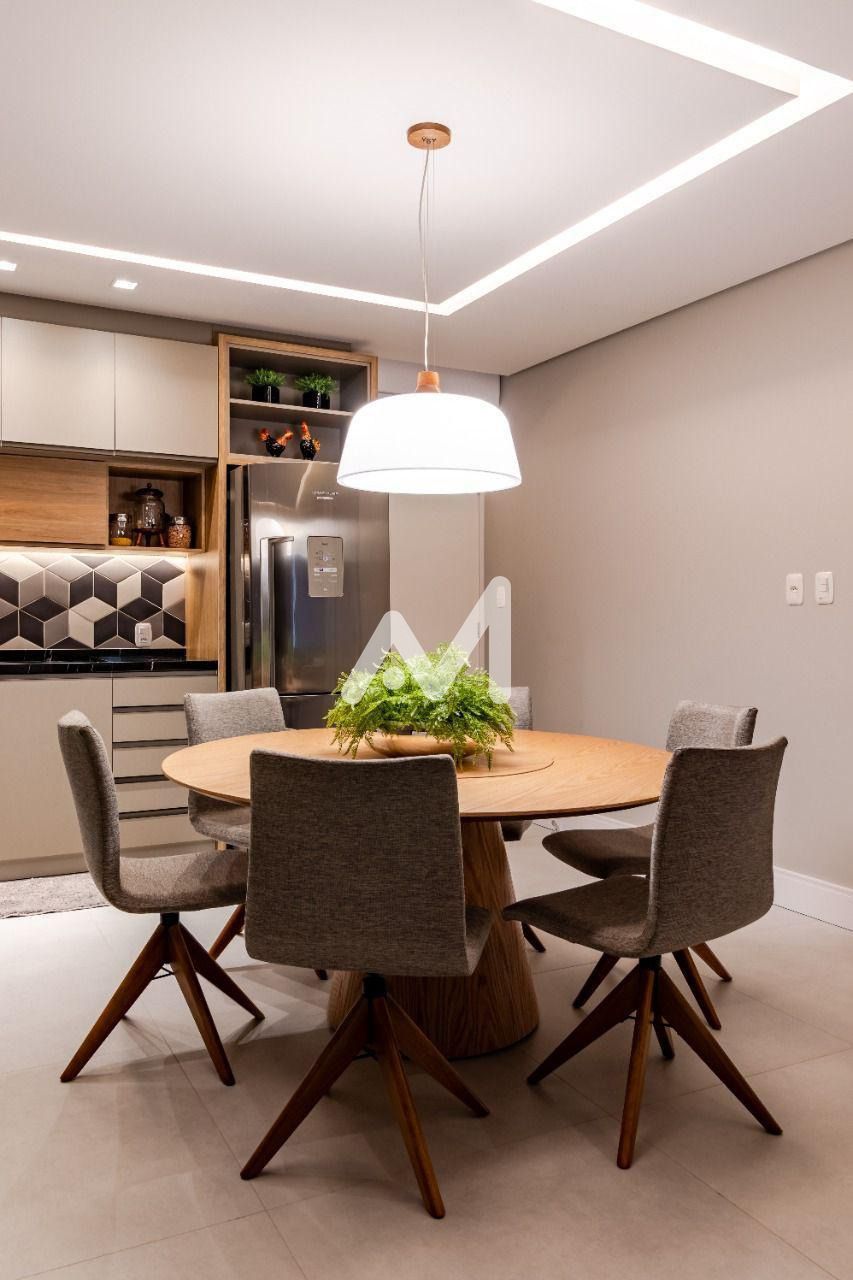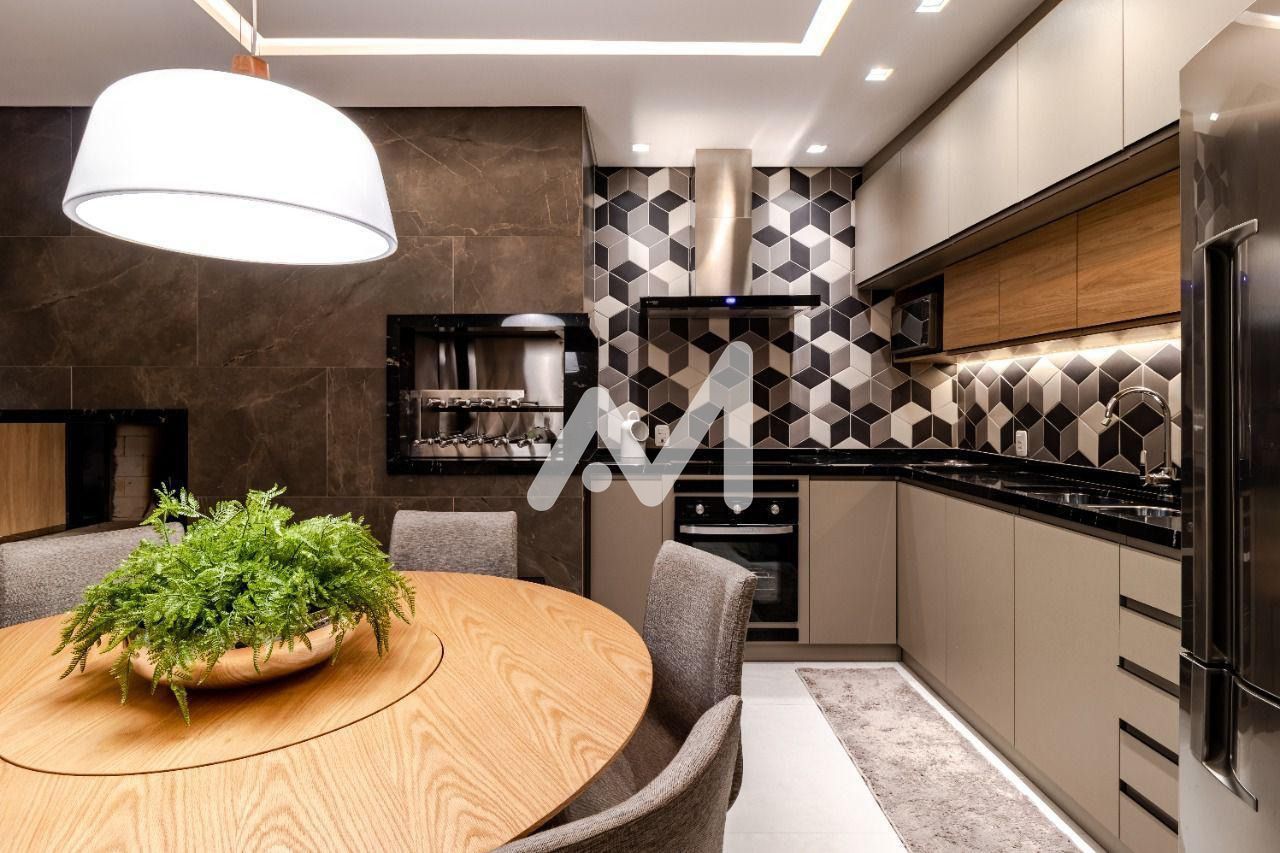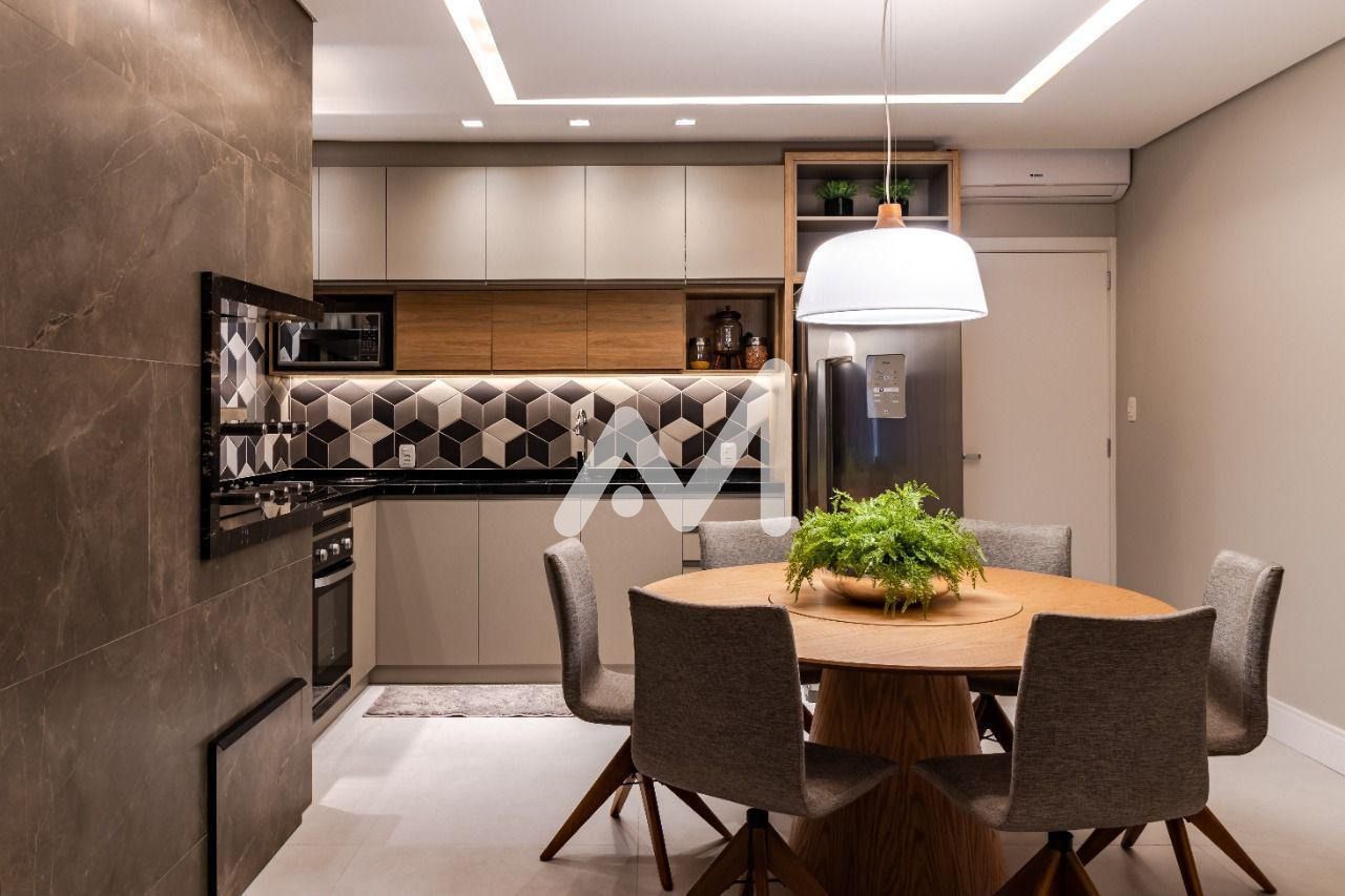 Móveis sob medida, geladeira, forno, micro-ondas, fogão por indução, coifa, churrasqueira rotativa e mesa com seis cadeiras.