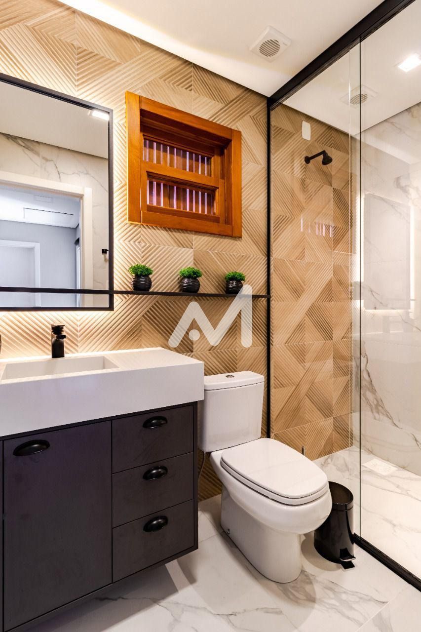 Móvel sob medida com granito e espelho, um com chuveiro, box.