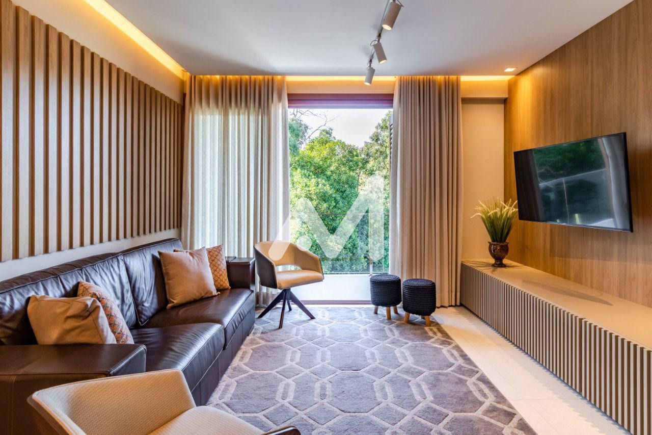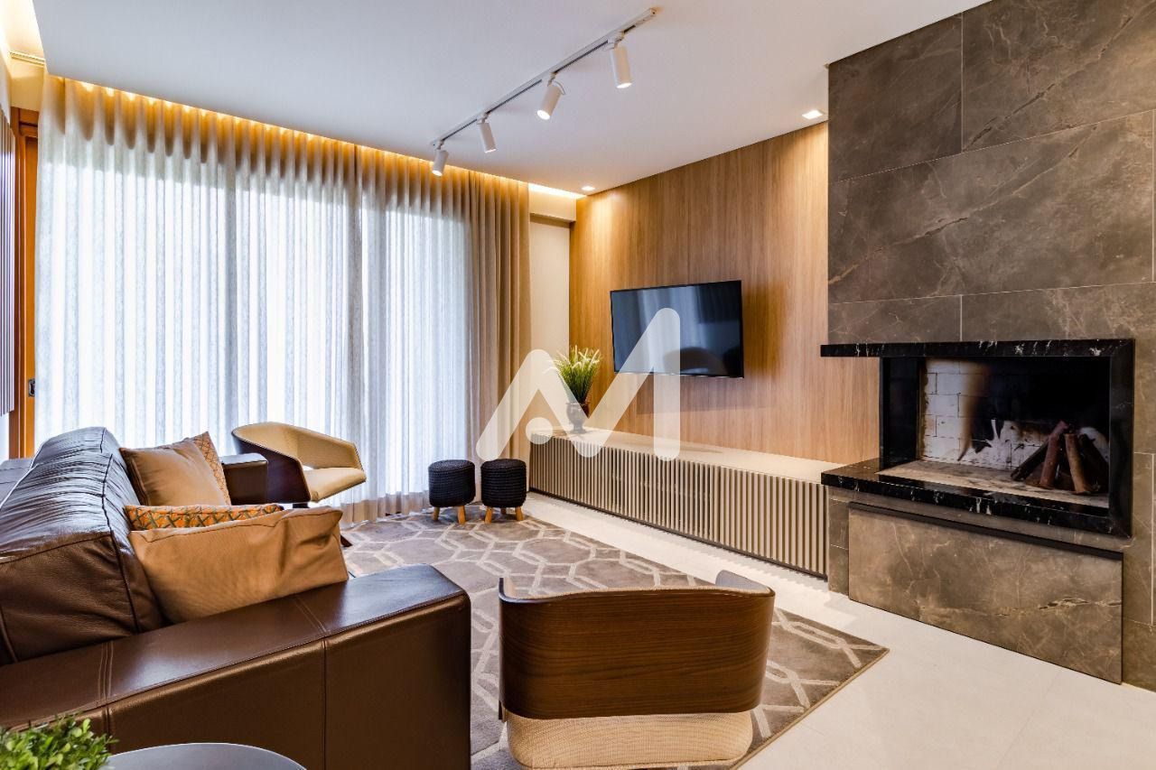 Ambiente amplo e integrado com lareira, equipado com móveis sob medida, sofá, dois tapetes, poltrona+pufer, mesinha lateral sofa, cinco quadros decorativos, decoração das parateleiras e ar condicionado.