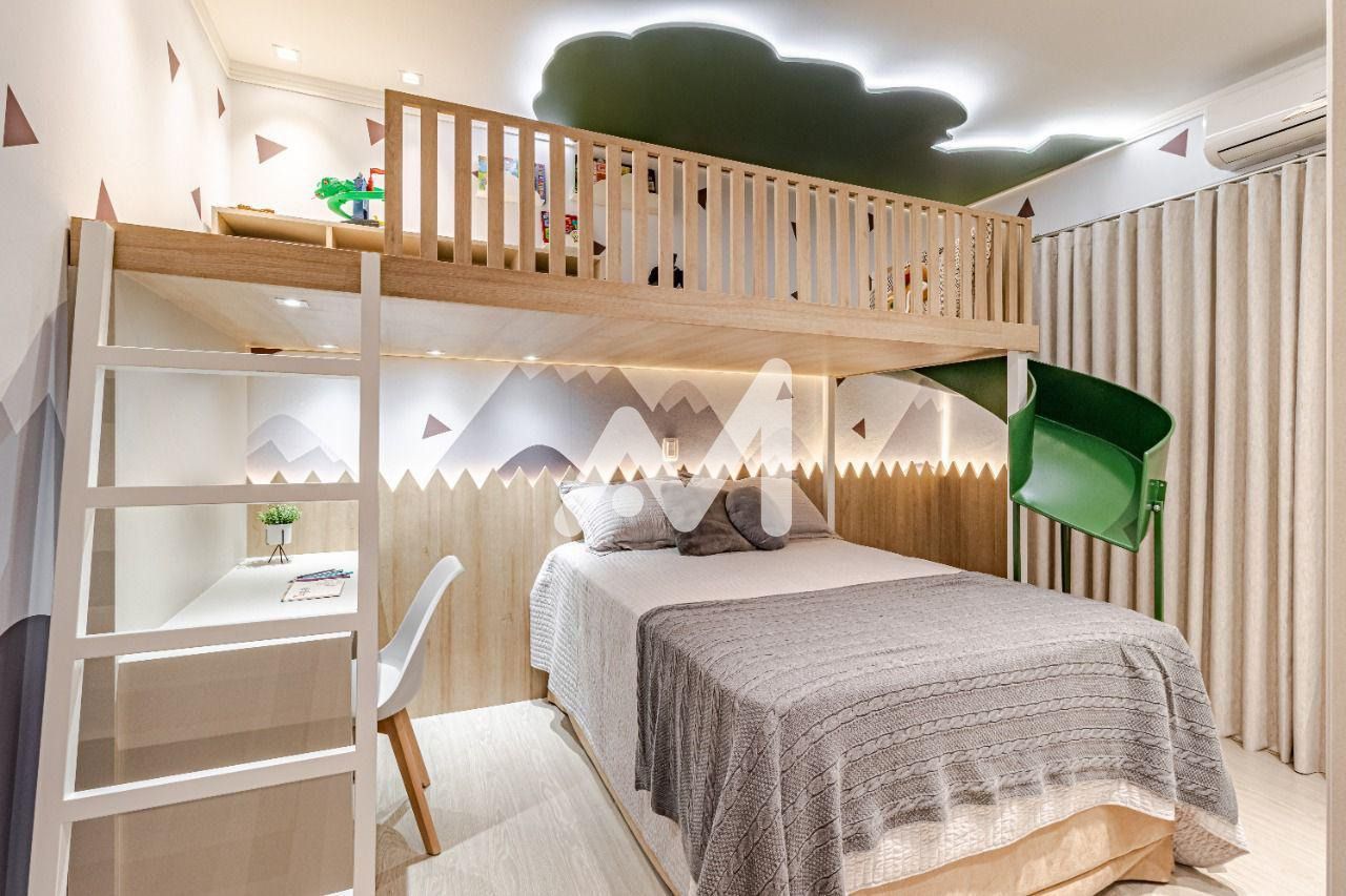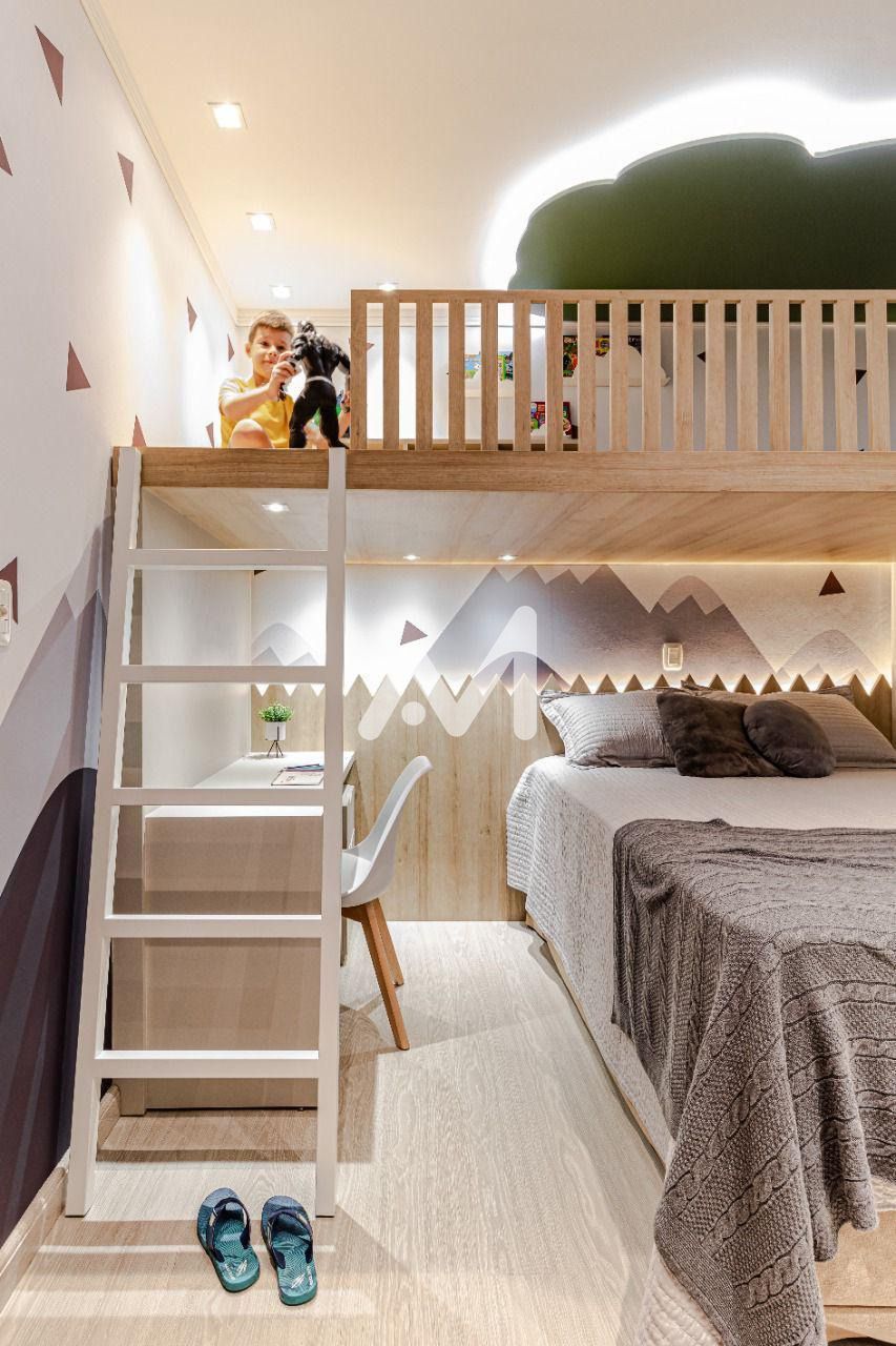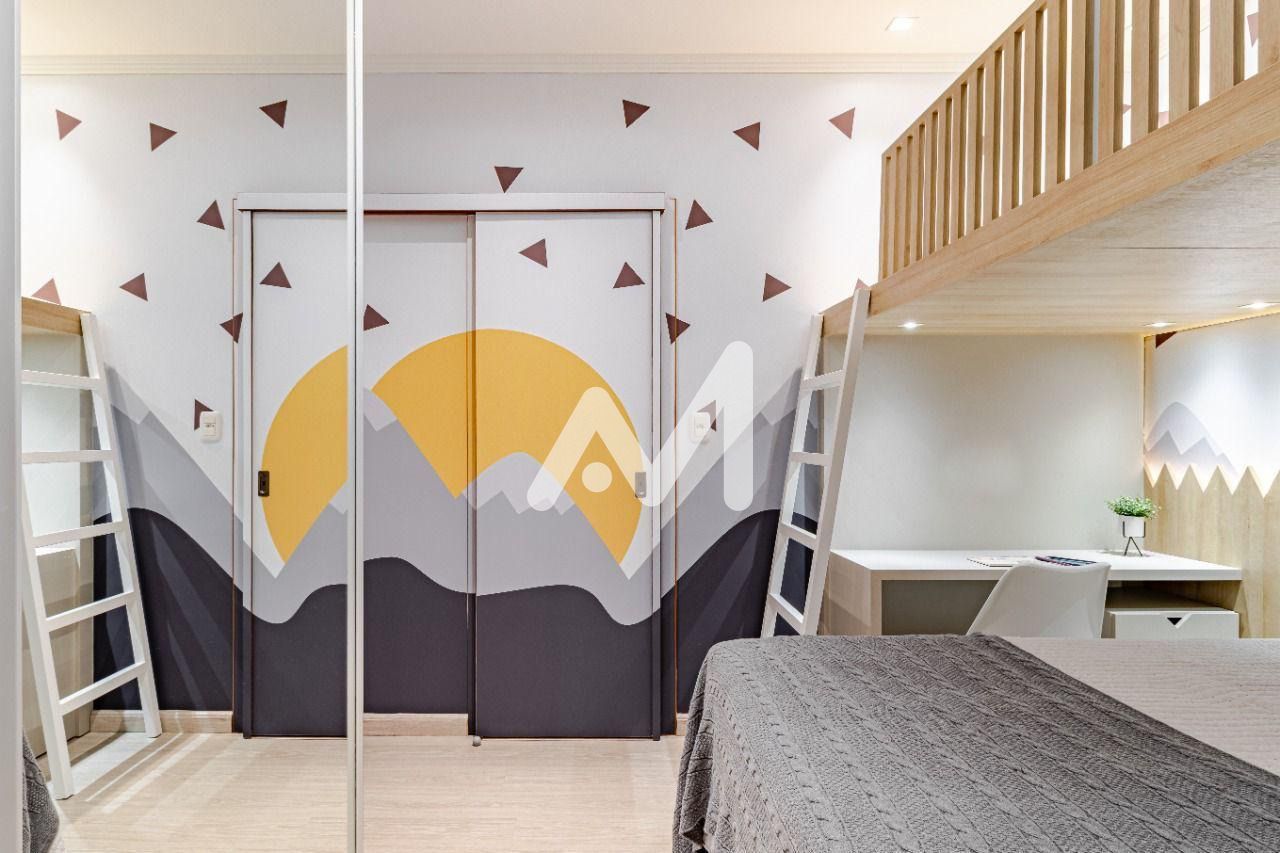 Roupeiro sob medida, mezanino com escada e escorregador, paredes adesivadas, revestimento em MDF, cama, cortinas e ar-condicionado.