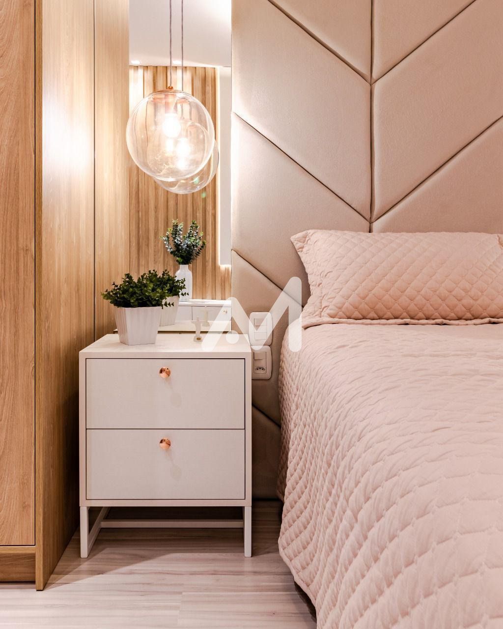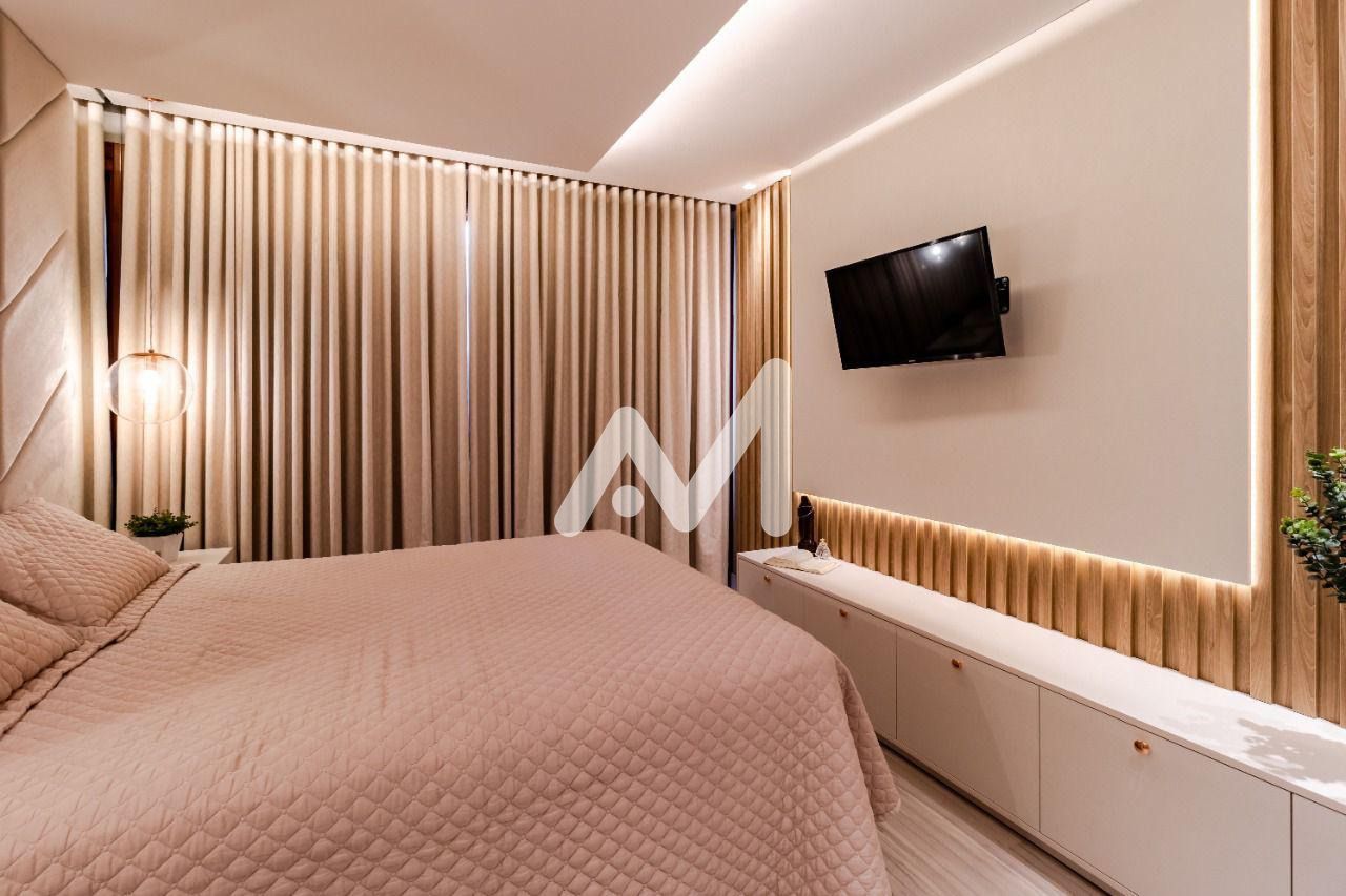 Móveis sob medida, painel da cama estofado, box para colchão 1.58x1.98, cortinas, espelho, televisão e ar-condicionado.