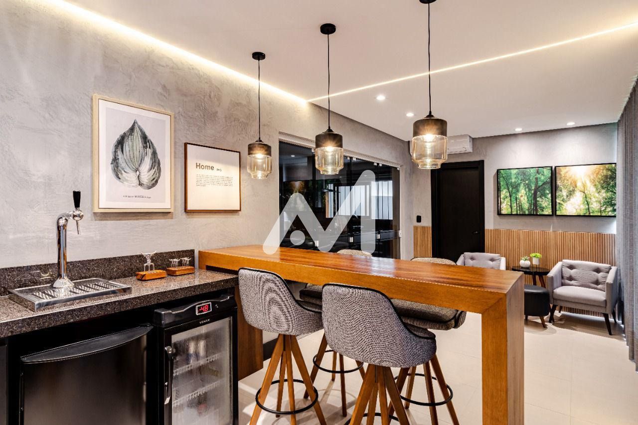 Móveis sob medida, churrasqueira rotativa, chopeira, bancada, quatro banquetas, duas poltronas, mesinha de apoio, dois quadros decorativos, cortinas e ar condicionado.