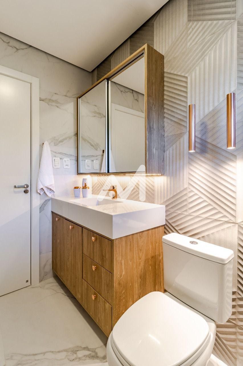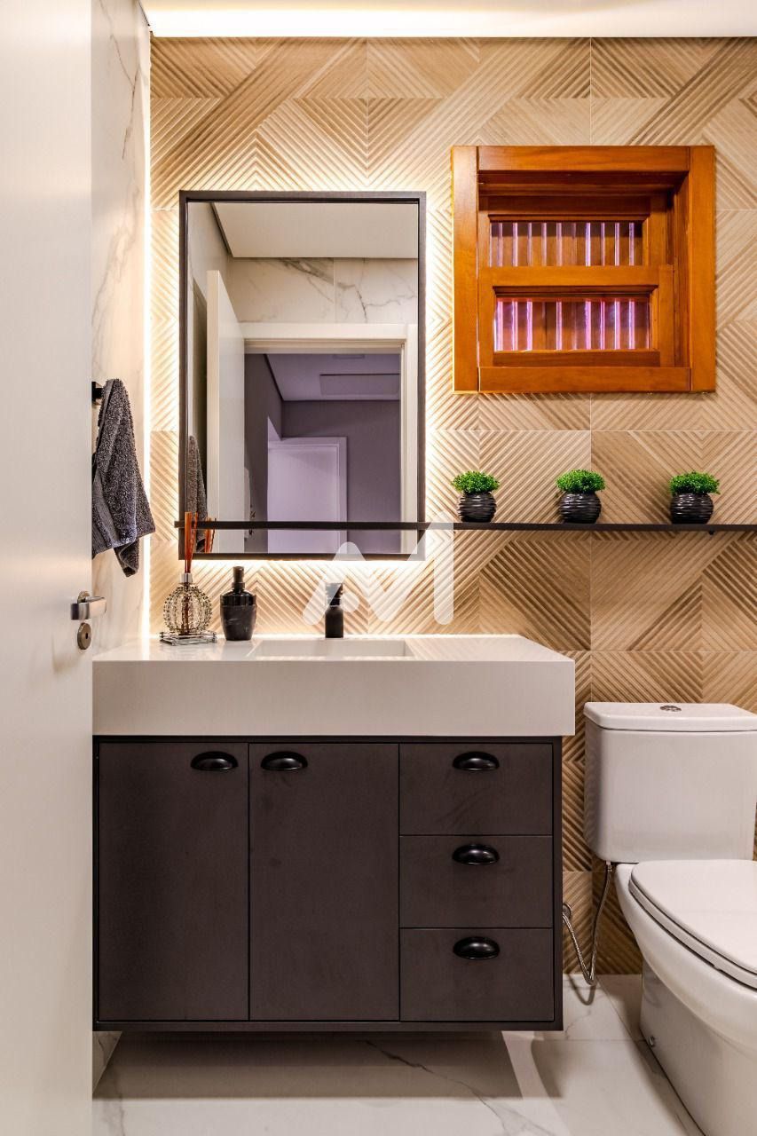 Móvel sob medida em pedra, espelho e vaso sanitário.