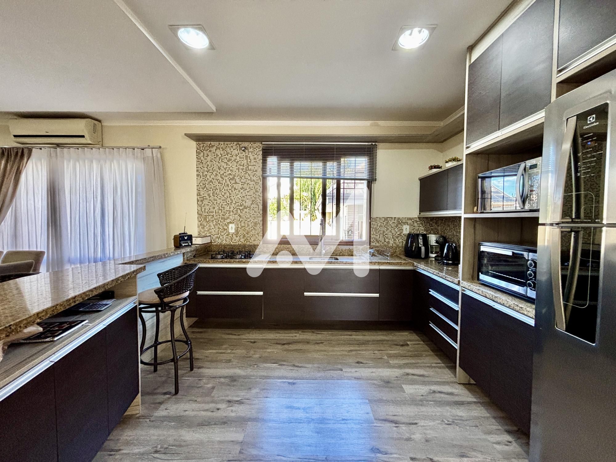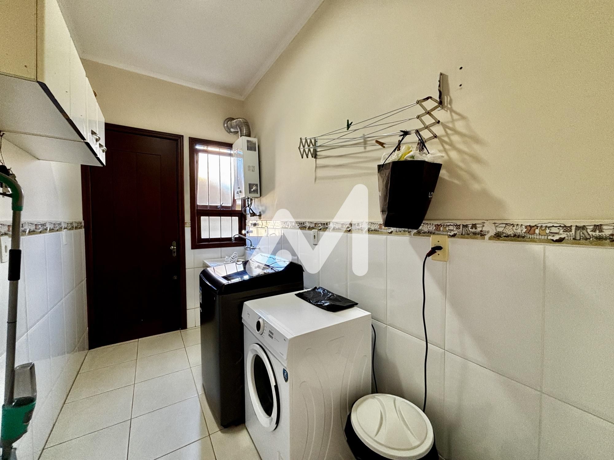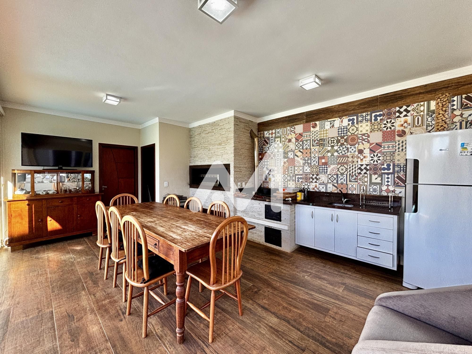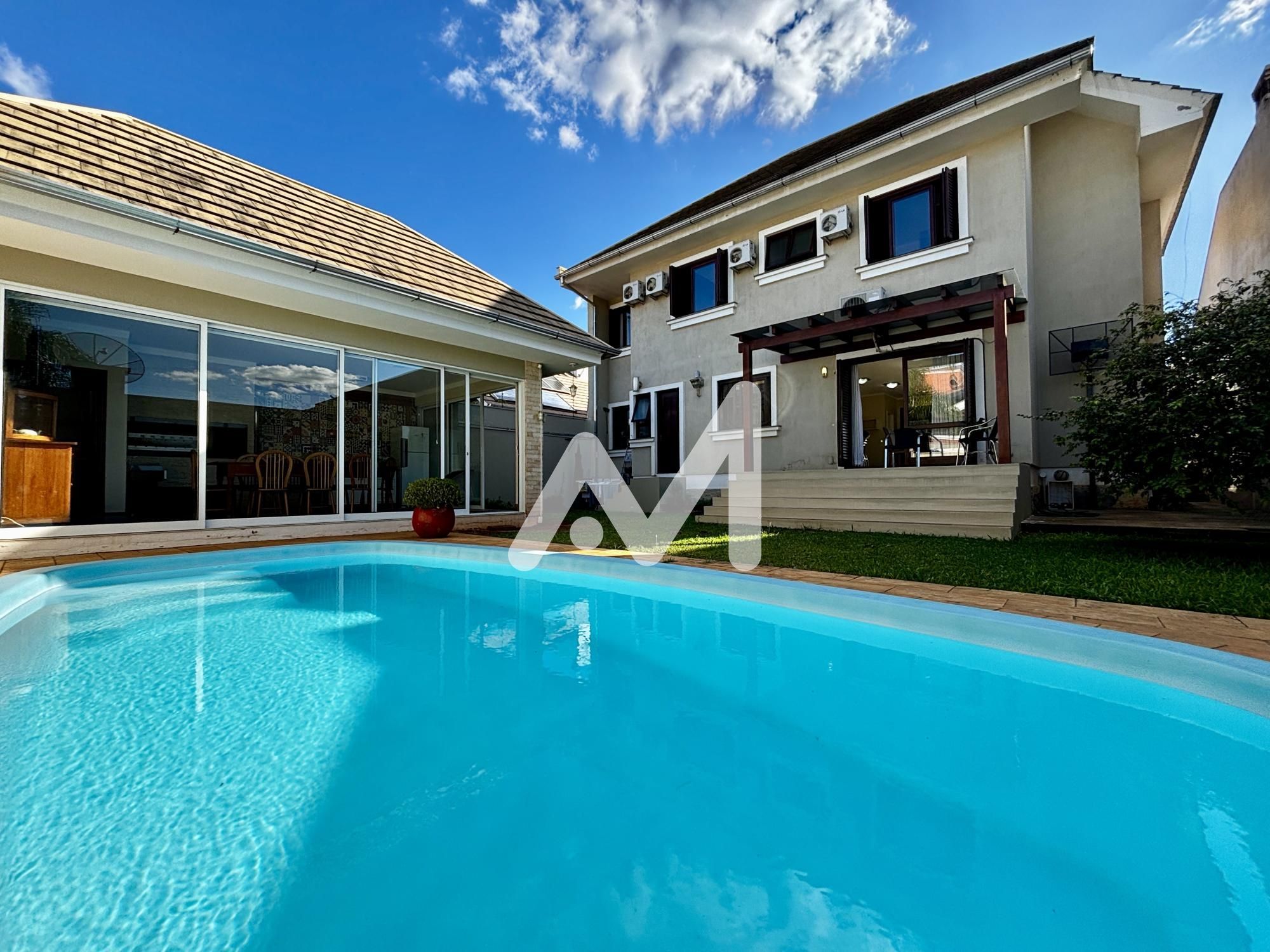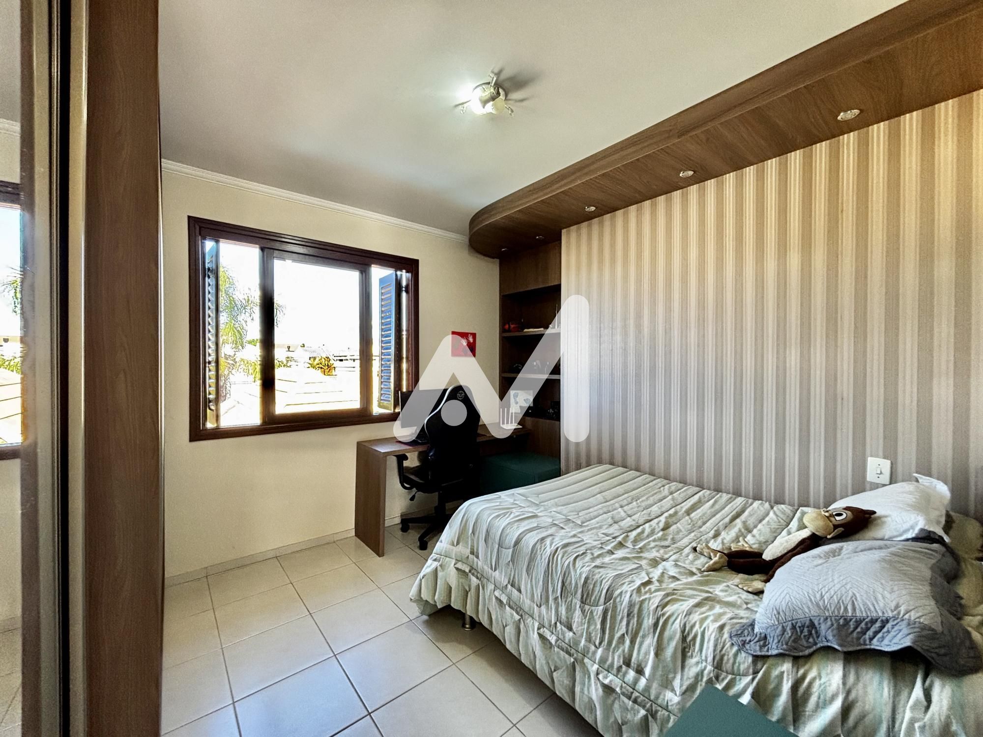 Casa 4 dormitórios, peças amplas e bem arejadas, parte superior com 86,65m², piso cerâmico, suite com closet e sacada, banheiro da suite com espera para banheira, banheiro social e mais 3 dormitórios. Parte inferior com 125,92m², sala de estar com pé direito duplo, lareira, lavabo, rebaixamento em gesso, cozinha americana, sala de jantar, área de serviço separada, escritório, garagem para dois carros, churrasqueira, piso cerâmico. Quiosque com 36m², churrasqueira rotativa, fogão a lenha, dispensa e banheiro, piscina, casa murada, portão eletrônico, cerca elétrica, alarme e placa solares. Excelente localização.