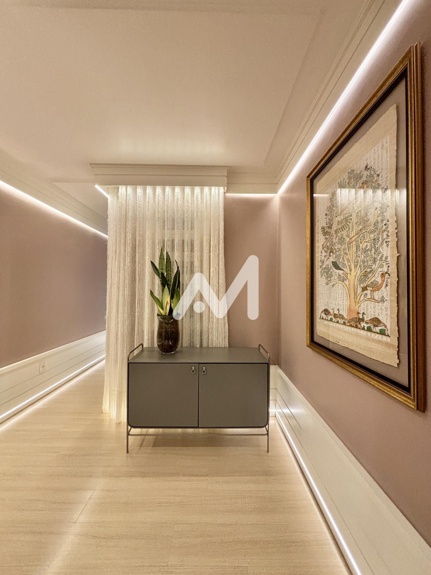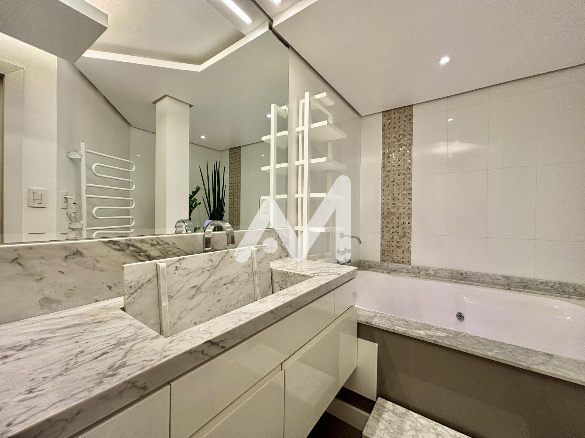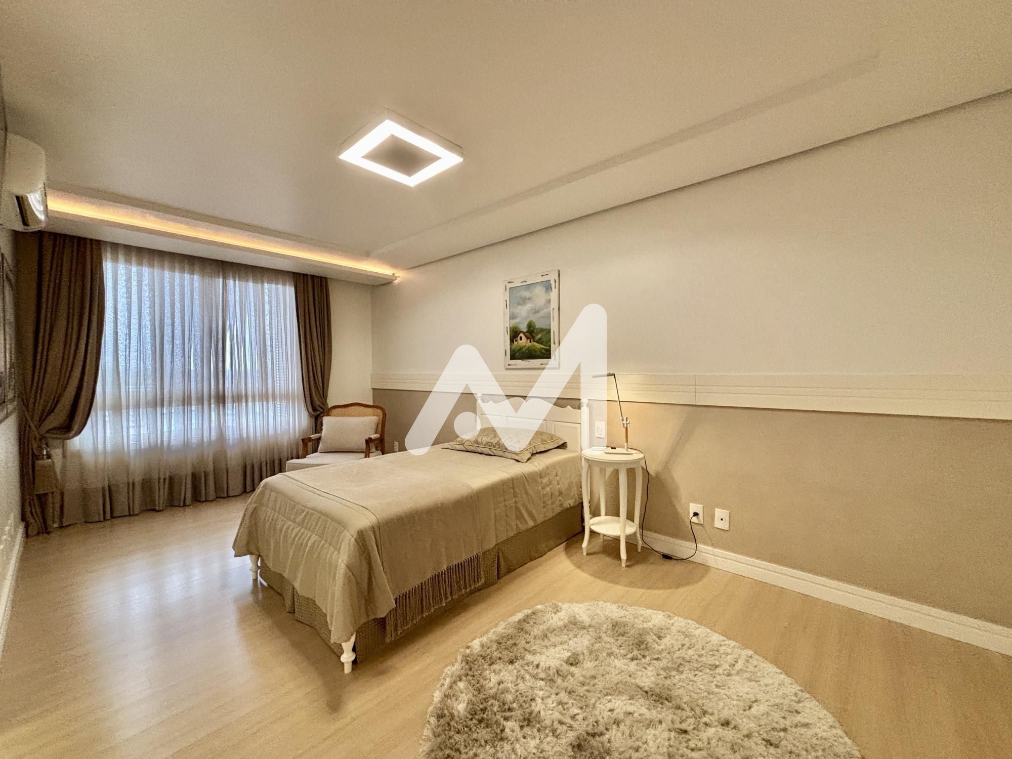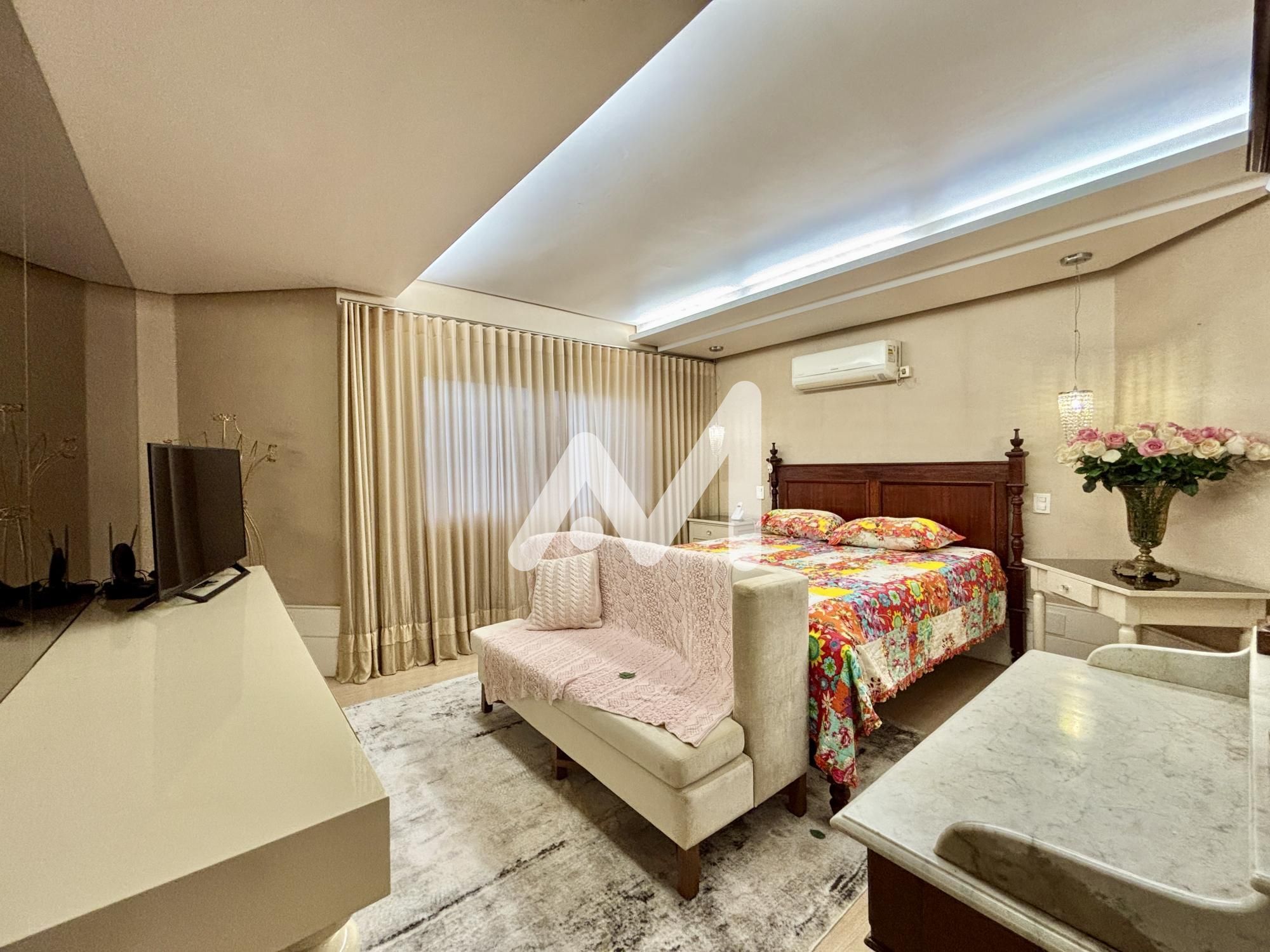 Elegante cobertura duplex semimobiliada, composta por 04 dormitórios, sendo 01 suíte master com closet e banheira de hidromassagem, 03 suítes, lareira e sacada, amplo banheiro social, sala de jogos, sala de TV, sala de jantar, sala de estar com lareira e sacada, lavabo, cozinha com móveis sob medida, ampla área de serviço, dependência de empregada, banheiro de serviço, salão de festas com churrasqueira e cozinha sob medida, banheiro social, terraço com piscina, água quente, 04 boxes de estacionamento, video monitoramento, dois elevadores, salão de festas, área de lazer em frente ao prédio.