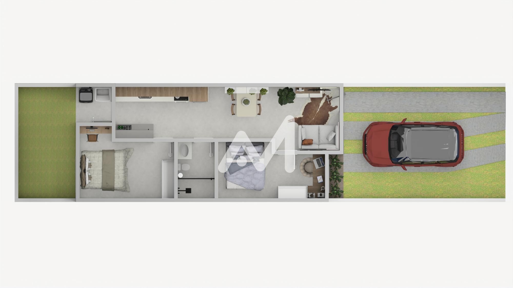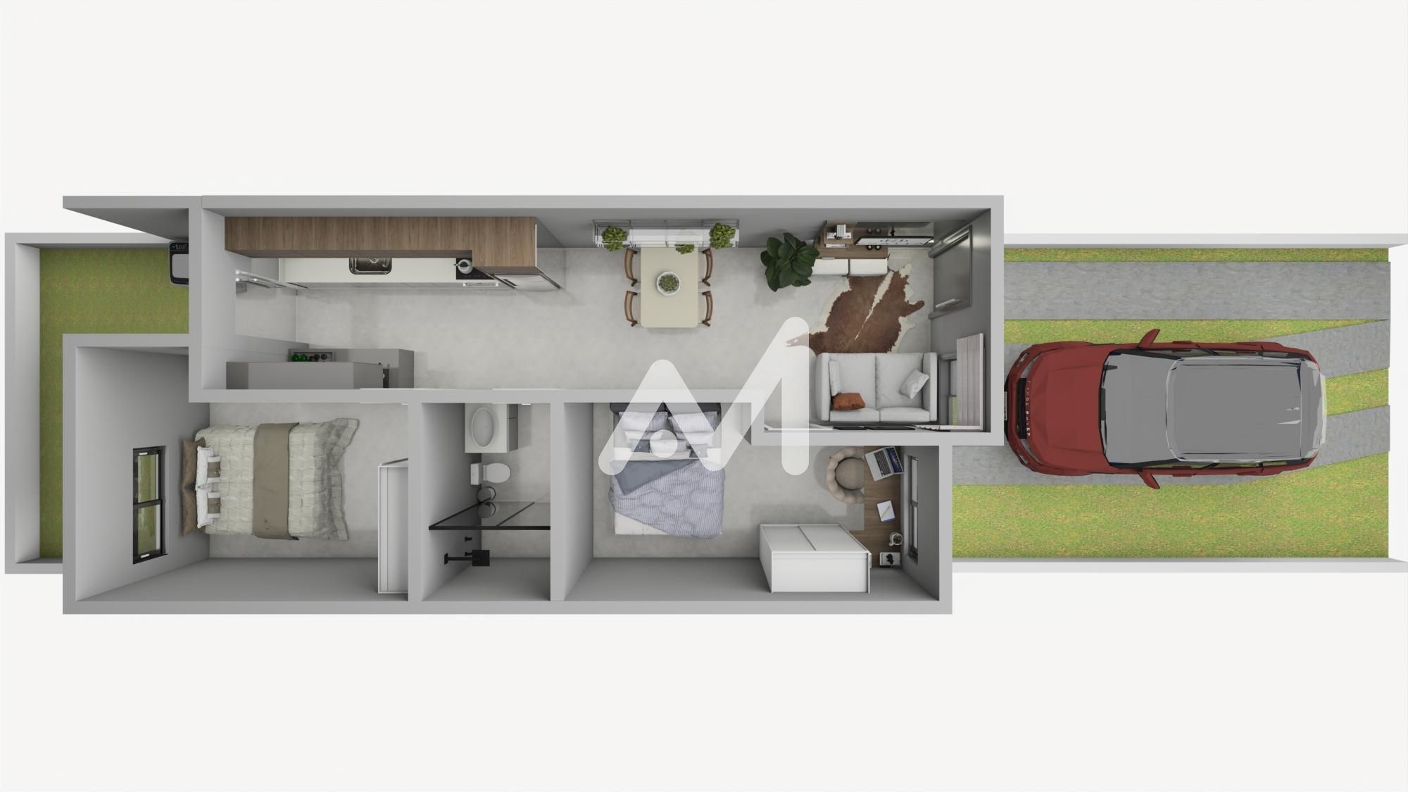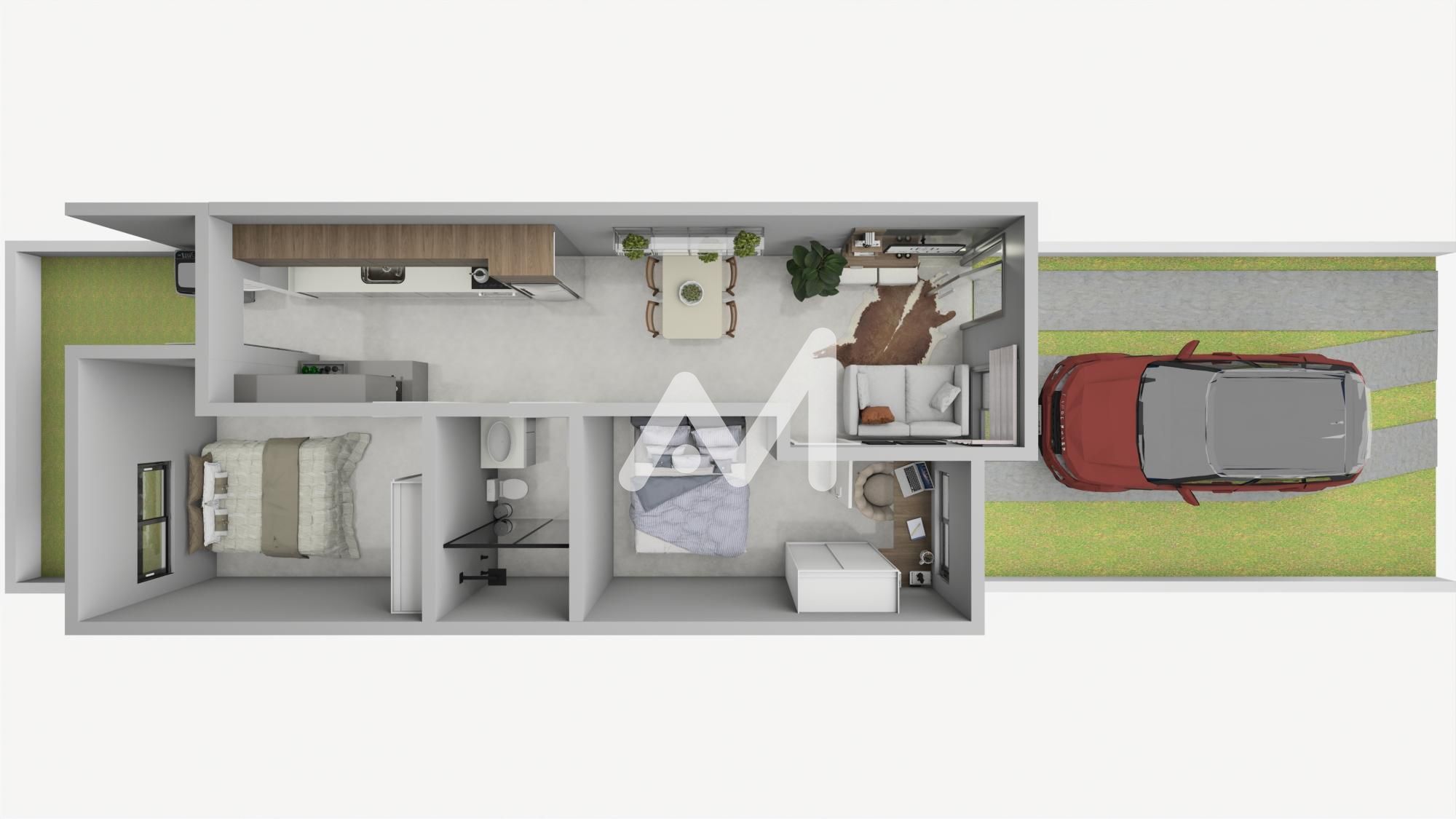 Belíssimo geminado composto por 02 dormitórios, cozinha, sala de estar/jantar, área de serviço, banheiro social, varanda, garagem para 01 carro.