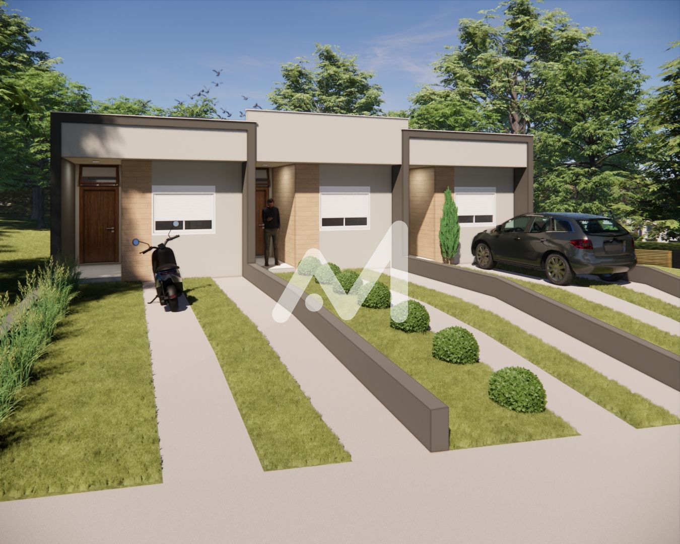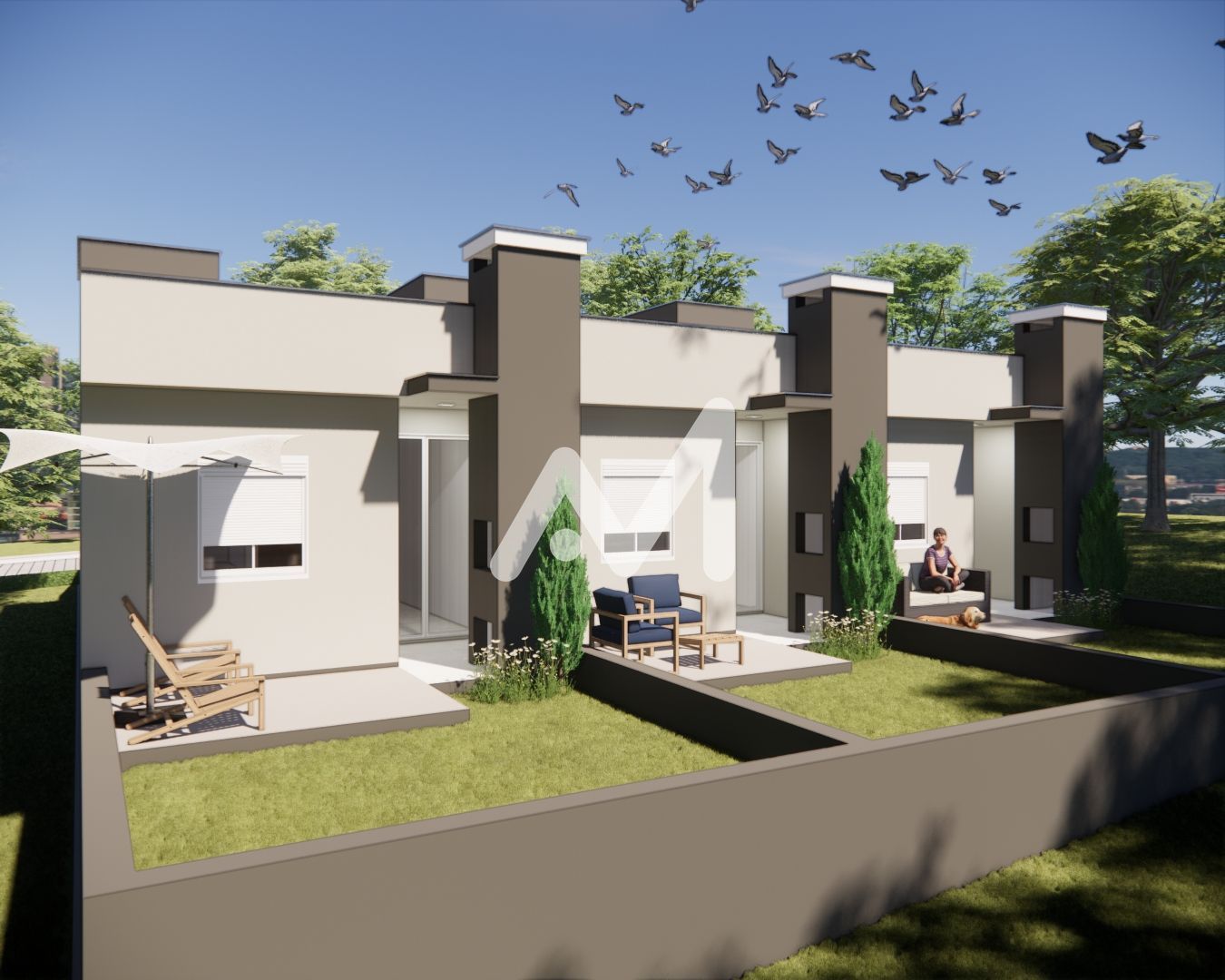 Belíssimo geminado composto por 02 dormitórios, cozinha, sala de estar/jantar, área de serviço, banheiro social, varanda, amplo pátio, garagem para 01 carro.