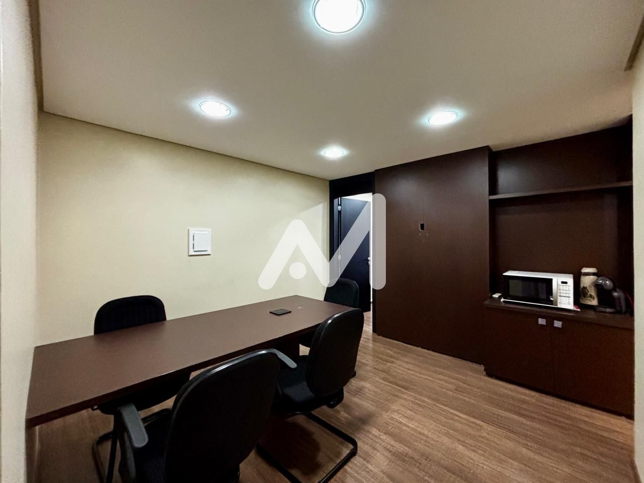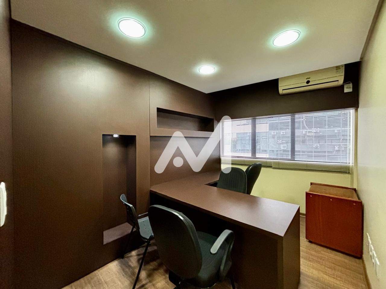 Sala comercial mobiliada e equipada, lateral em ótima posição, piso laminado, sala de reunião, e duas salas e atendimento com móveis projetados, dois split, prédio com elevador e recepção.