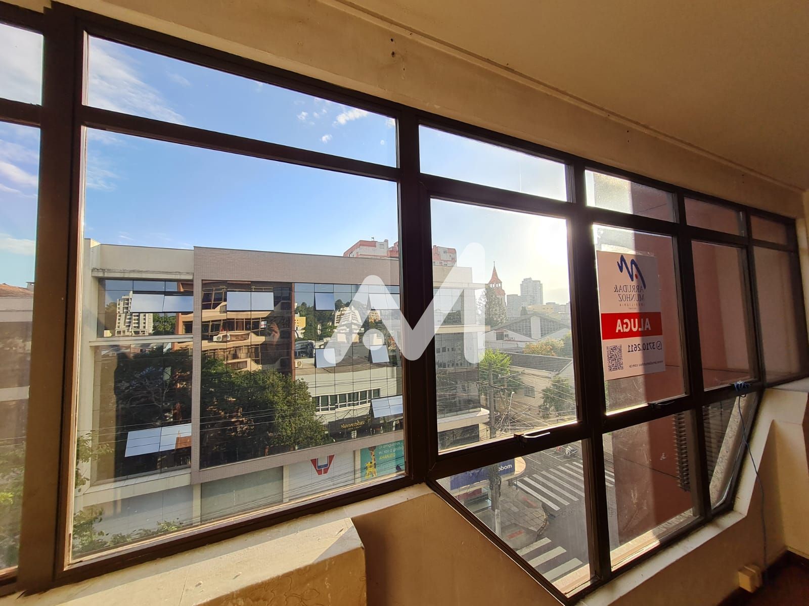 Sala comercial com excelente localização! 5º andar, semimobiliada, recepção, banheiro social, 03 salas individuais, com vista de frente e Box de estacionamento.