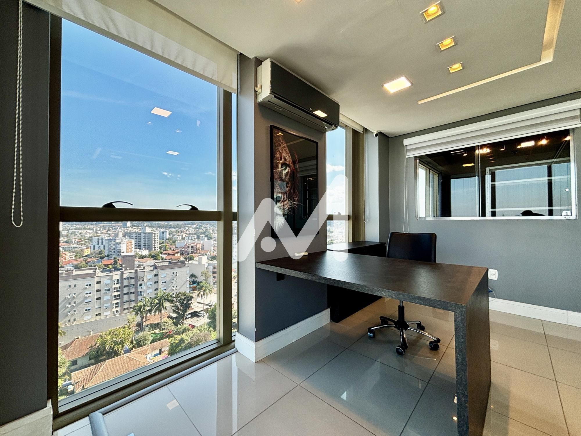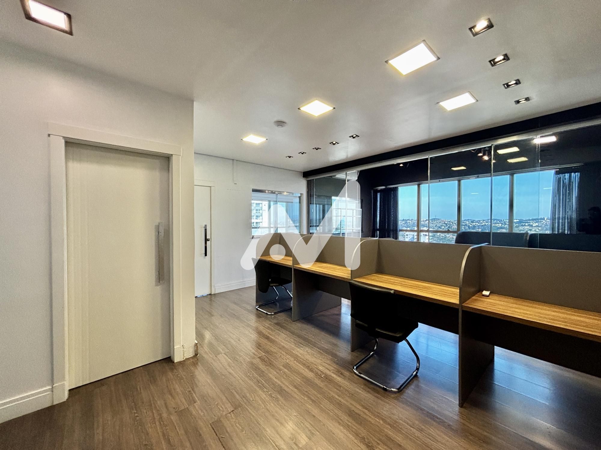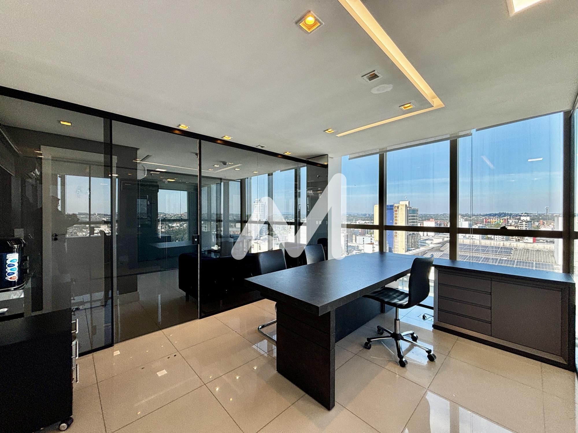 Excelente sala comercial, mobiliada, divisórias em vidro, cozinha, banheiro, andar alto, climatizada, mesas de trabalho, luminárias, um box de estacionamento. Prédio com dois elevadores e auditório.