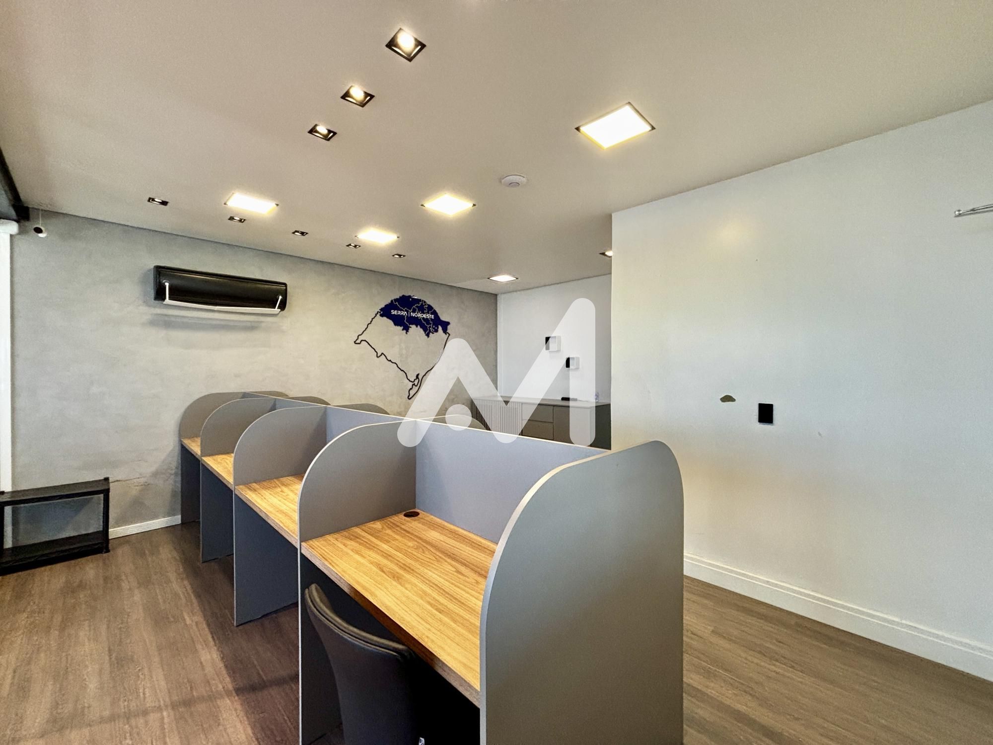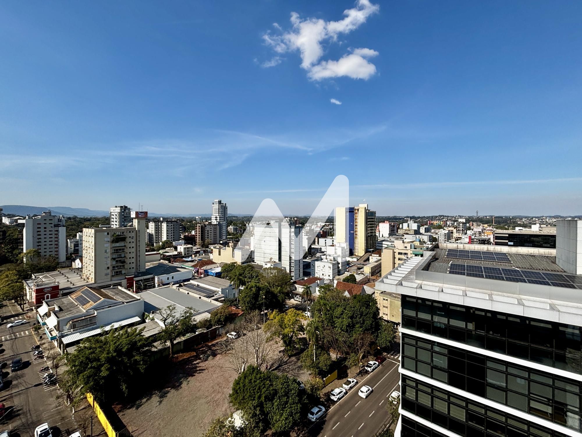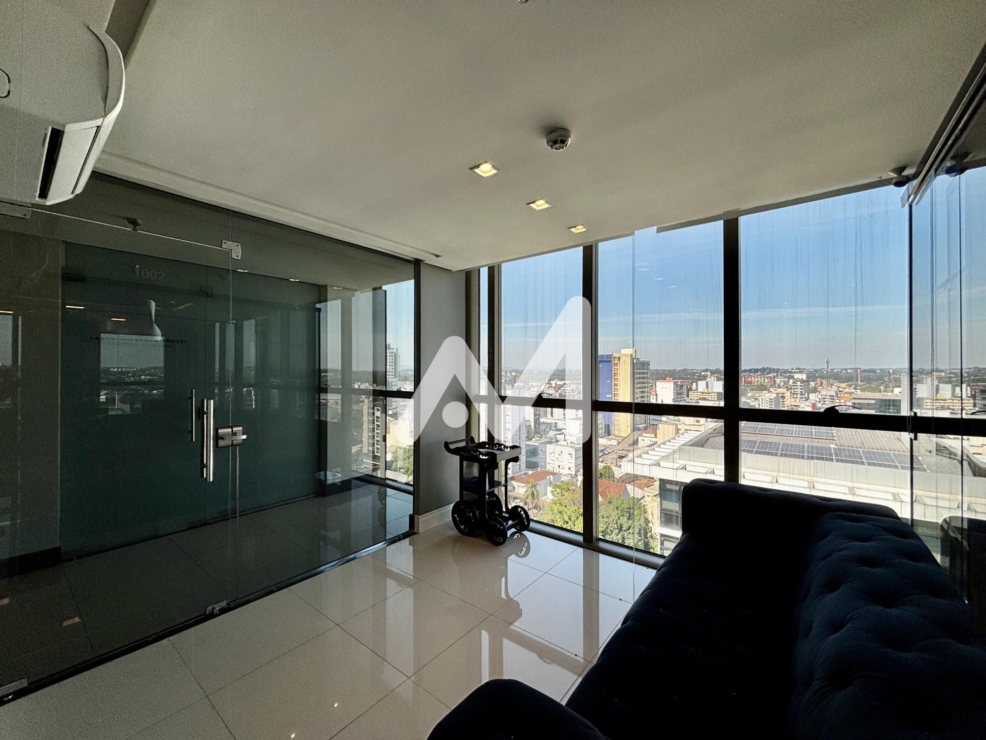 Excelente sala comercial, mobiliada, divisórias em vidro, cozinha, banheiro, andar alto, climatizada, mesas de trabalho, luminárias, um box de estacionamento. Prédio com dois elevadores e auditório.