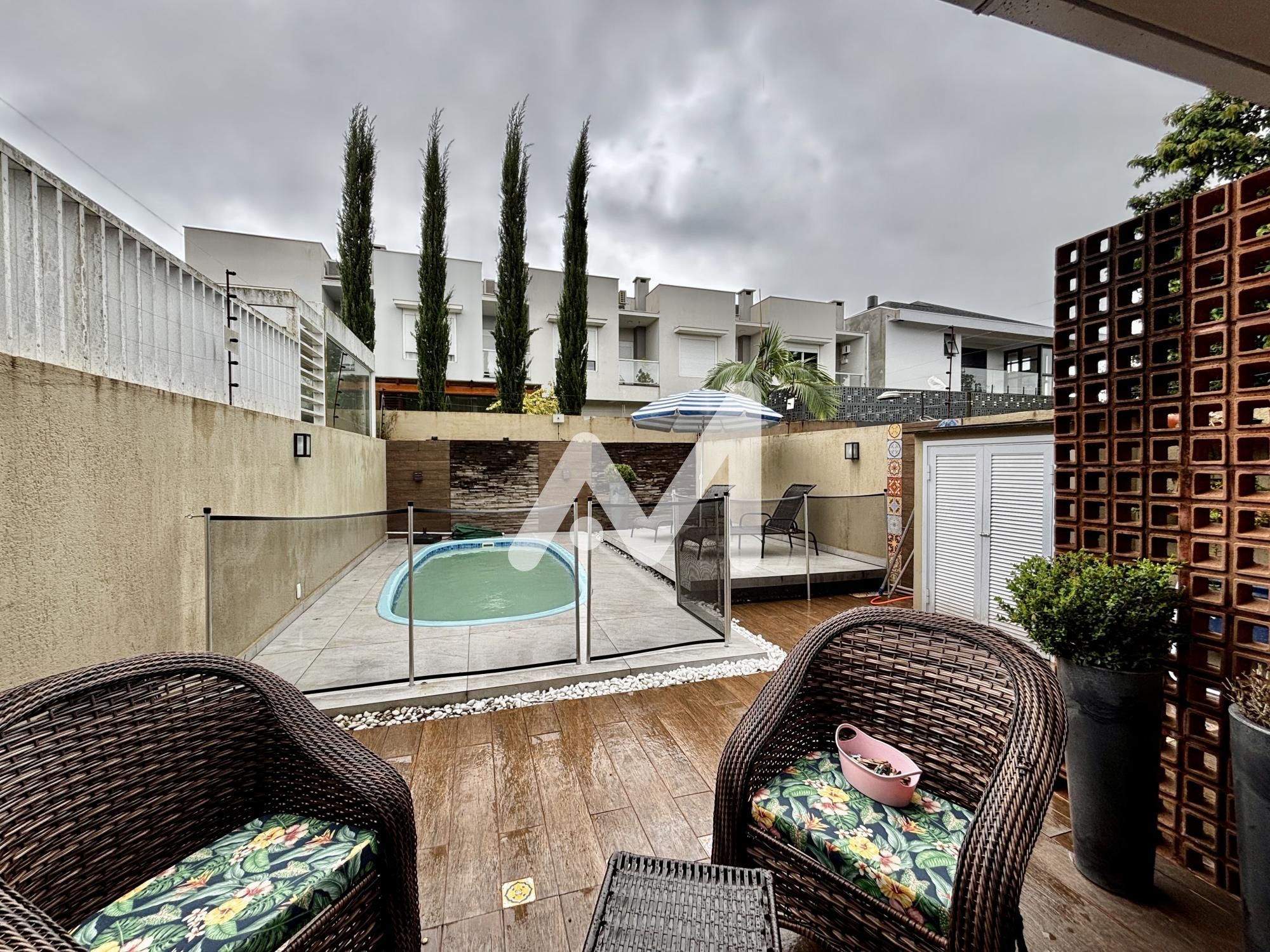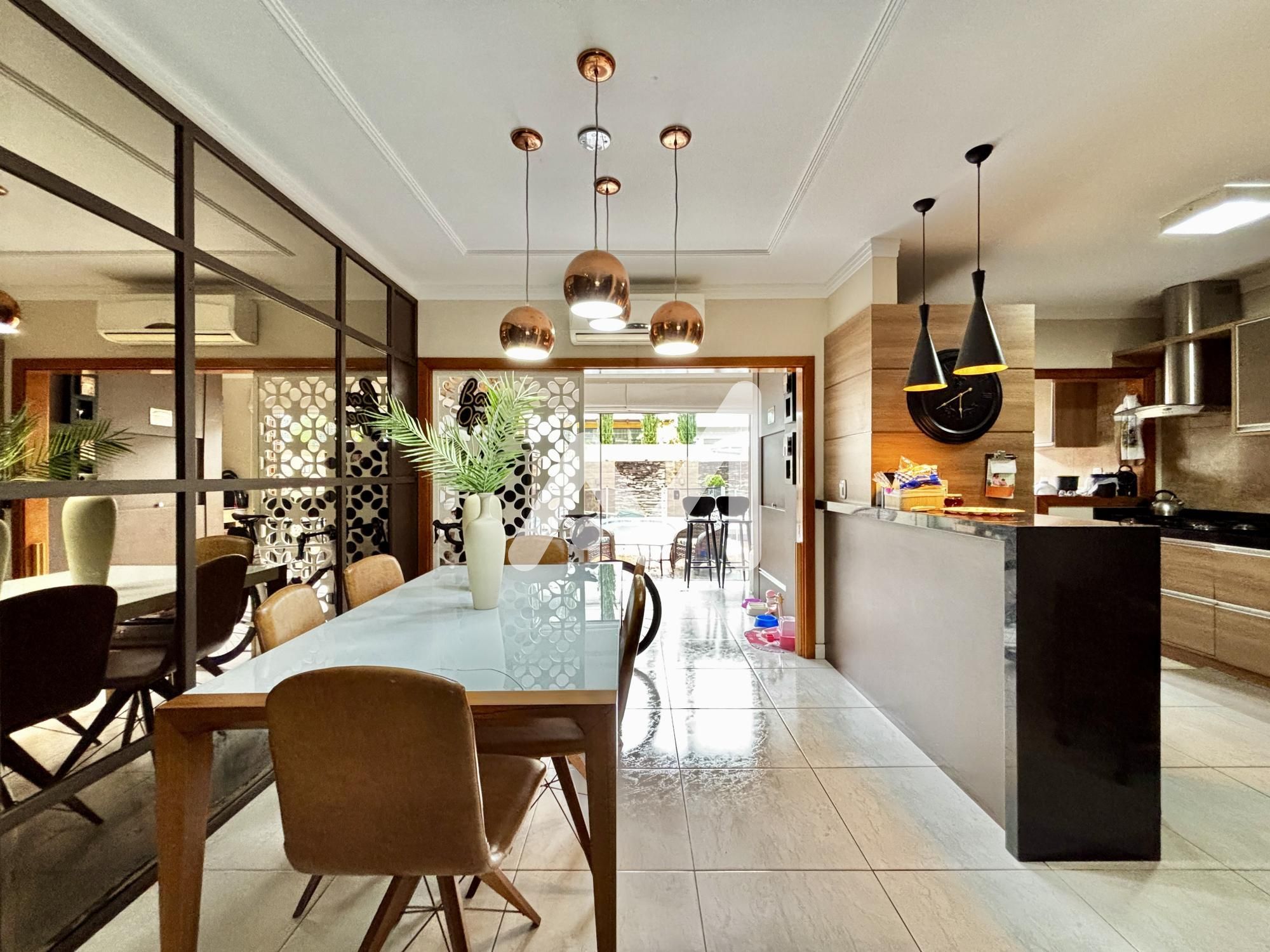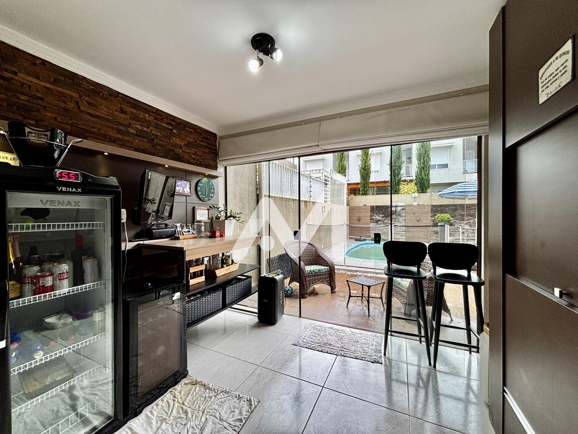 Belíssimo sobrado semimobiliado com móveis planejados, 03 dormitórios, sendo 01 suíte, sacada, cozinha, sala de estar/jantar, espaço gourmet, amplo pátio com piscina, área serviço, lavabo, lareira, acabamento em gesso, churrasqueira, garagem para 02 carro, cercado e murado.